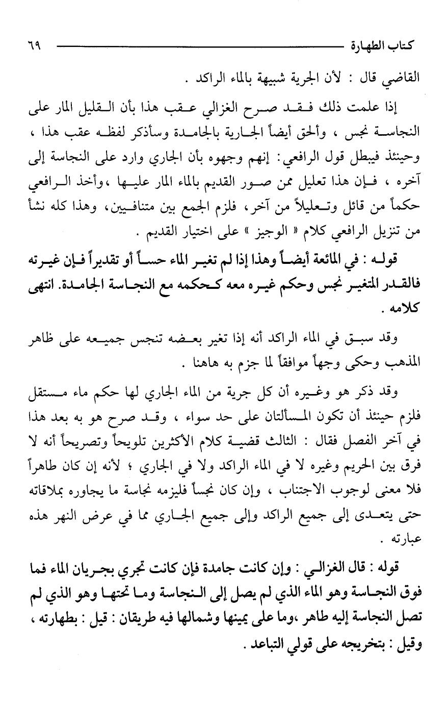 إذا علمت ذلك فقد صرح الغزالي عقب هذا بأن القليل المار على النجاسة نجس، وألحق أيضًا الجارية بالجامدة وسأذكر لفظه عقب هذا، وحينئذ فيبطل قول الرافعي: إنهم وجهوه بأن الجاري وارد على النجاسة إلى آخره، فإن هذا تعليل ممن صور القديم بالماء المار عليها، وأخذ الرافعي حكمًا من قائل وتعليلًا من آخر، فلزم الجمع بين متنافيين، وهذا كله نشأ من تنزيل الرافعي كلام "الوجيز" على اختيار القديم.