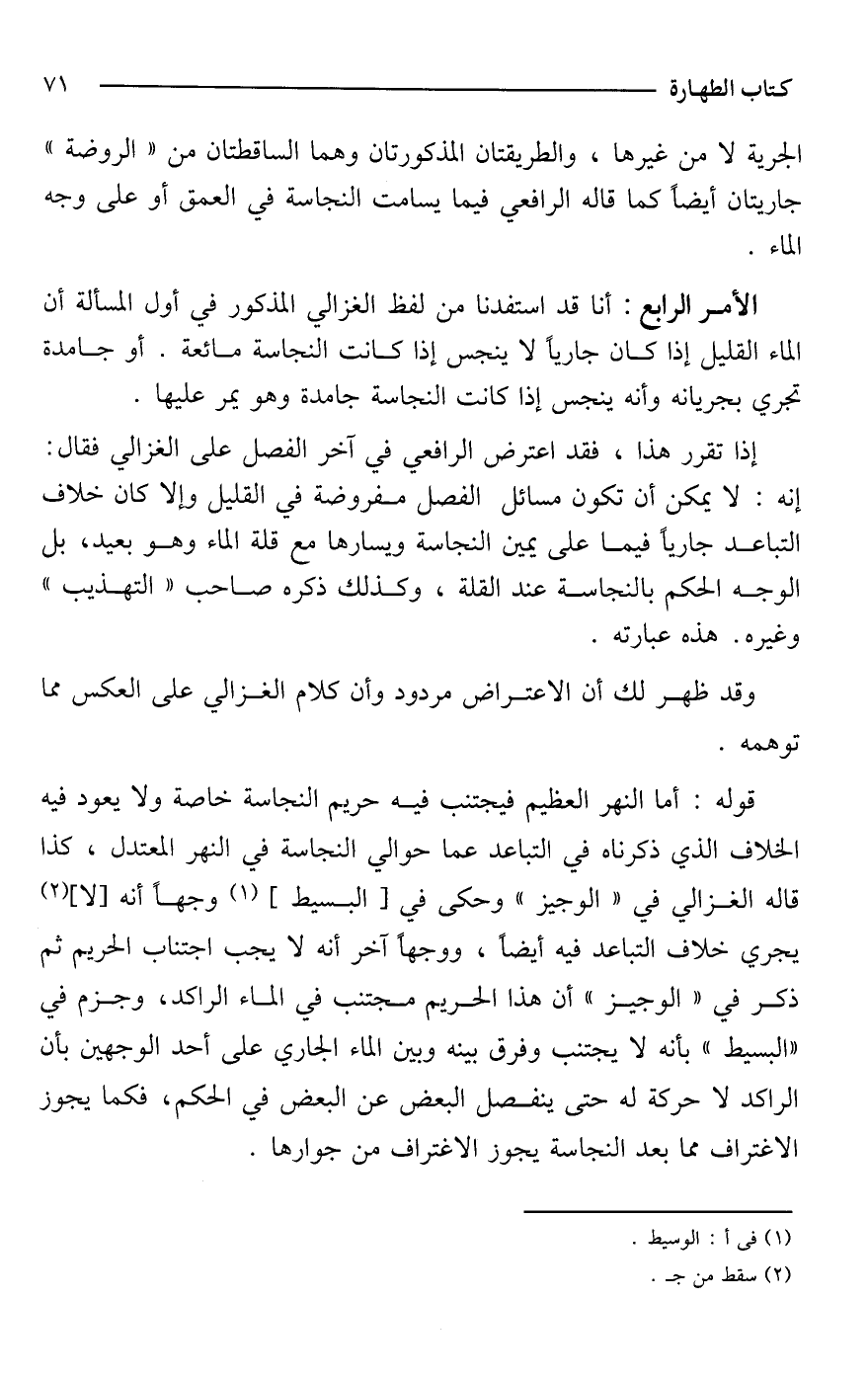 الأمر الرابع: أنا قد استفدنا من لفظ الغزالي المذكور في أول المسألة أن الماء القليل إذا كان جاريًا لا ينجس إذا كانت النجاسة مائعة. أو جامدة تجري بجريانه وأنه ينجس إذا كانت النجاسة جامدة وهو يمر عليها.