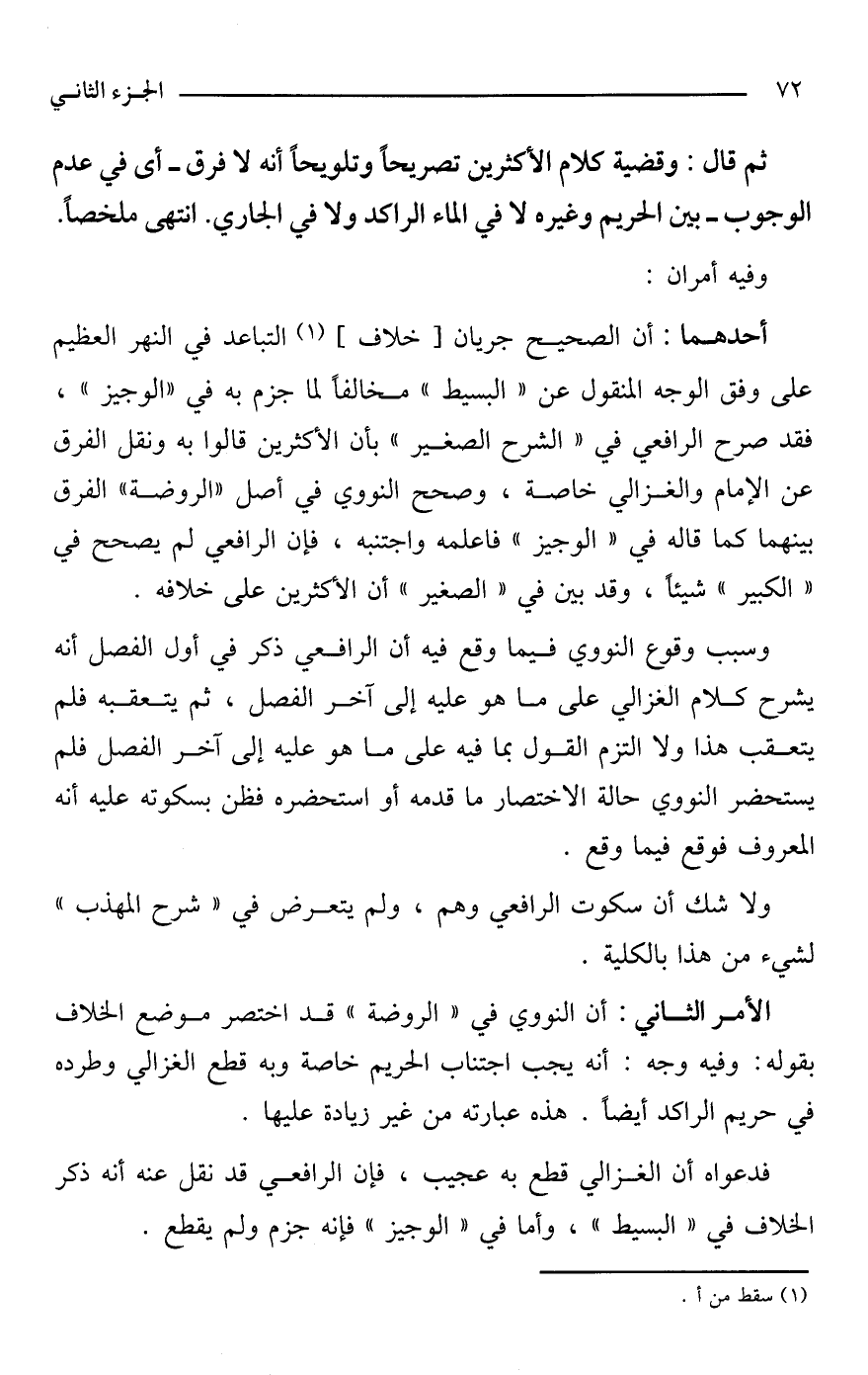 الأمر الثاني: أن النووي في "الروضة" قد اختصر موضع الخلاف بقوله: وفيه وجه: أنه يجب اجتناب الحريم خاصة وبه قطع الغزالي وطرده في حريم الراكد أيضًا. هذه عبارته من غير زيادة عليها.