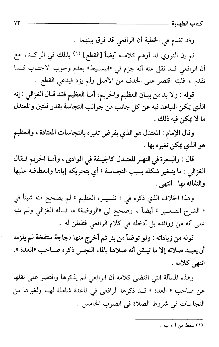 قوله: ولابد من بيان العظيم والحريم، أما العظيم فقد قال الغزالي: إنه الذي يمكن التباعد فيه عن كل جانب من جوانب النجاسة بقدر قلتين والمعتدل ما لا يمكن فيه ذلك.
