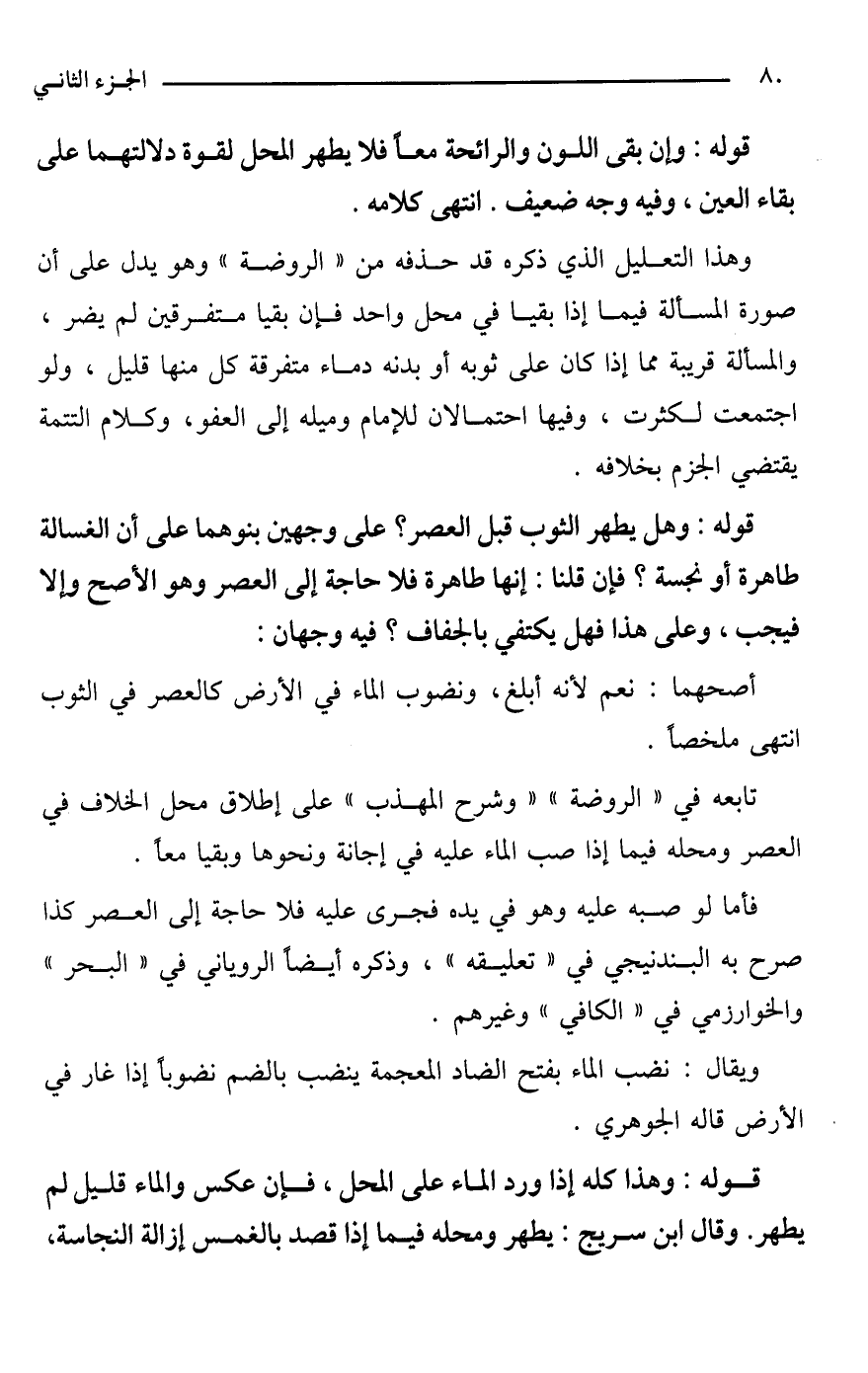 قوله: وإن بقى اللون والرائحة معًا فلا يطهر المحل لقوة دلالتهما على بقاء العين، وفيه وجه ضعيف. انتهى كلامه.