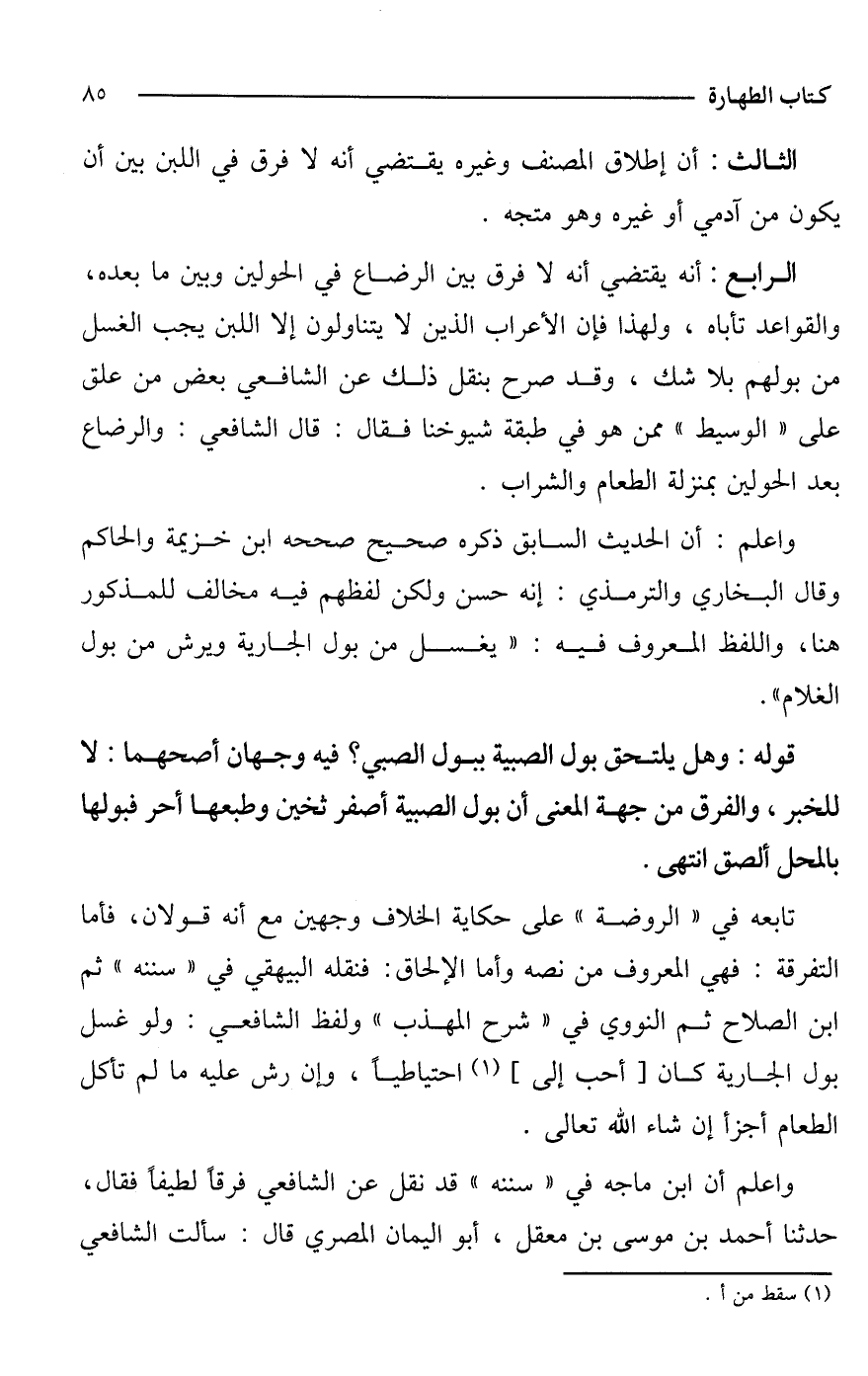 الرابع: أنه يقتضي أنه لا فرق بين الرضاع في الحولين وبين ما بعده، والقواعد تأباه، ولهذا فإن الأعراب الذين لا يتناولون إلا اللبن يجب الغسل من بولهم بلا شك، وقد صرح بنقل ذلك عن الشافعي بعض من علق على "الوسيط" ممن هو في طبقة شيوخنا فقال: قال الشافعي: والرضاع بعد الحولين بمنزلة الطعام والشراب.