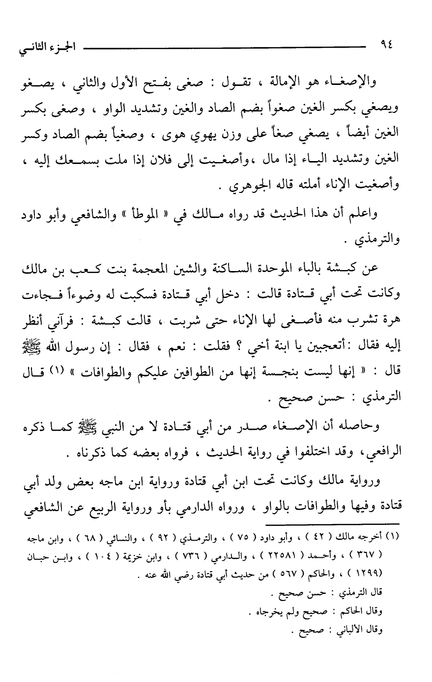 عن كبشة بالباء الموحدة الساكنة والشين المعجمة بنت كعب بن مالك وكانت تحت أبي قتادة قالت: دخل أبي قتادة فسكبت له وضوءًا فجاءت هرة تشرب منه فأصغى لها الإناء حتى شربت، قالت كبشة: فرآني أنظر إليه فقال: أتعجبين يا ابنة أخي؟ فقلت: نعم، فقال: إن رسول الله - صَلَّى اللَّهُ عَلَيْهِ وَسَلَّمَ - قال: "إنها ليست بنجسة إنها من الطوافين عليكم والطوافات" (¬1) قال الترمذي: حسن صحيح.