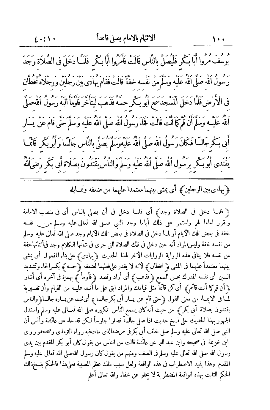 يُهَادَى بَيْنَ الرَّجُلَيْنِ أَيْ يَمْشِي بَيْنَهُمَا مُعْتَمِدًا عَلَيْهِمَا مِنْ ضَعْفِهِ وَتَمَايُلِهِ لِيَنُوءَ أَيْ لِيَنْهَضَ