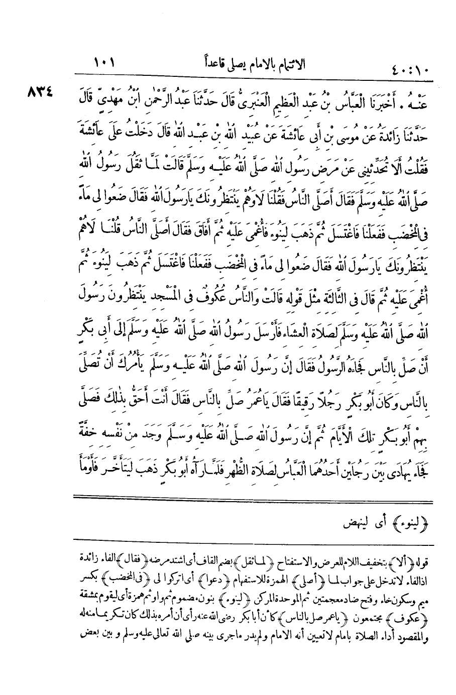 قَوْله أَلا بتَخْفِيف اللَّام للعرض والاستفتاح لما ثقل بِضَم الْقَاف أَي اشْتَدَّ مَرضه فَقَالَ الْفَاء زَائِدَة إِذْ الْفَاء لَا تدخل على جَوَاب لما أُصَلِّي الْهمزَة للاستفهام دعوا أَي اتْرُكُوا لي فِي المخضب بِكَسْر مِيم وَسُكُون خاء وَفتح ضاد معجمتين ثمَّ الْمُوَحدَة المركن لينوء بنُون مضموم ثمَّ وَاو ثمَّ همزَة أَي ليقوم بِمَشَقَّة عكوف مجتمعون يَا عمر صل بِالنَّاسِ كَأَن أَبَا بكر رَضِي الله عَنهُ رأى أَن أمره بذلك كَانَ تكريما مِنْهُ لَهُ وَالْمَقْصُود أَدَاء الصَّلَاة بِإِمَام لَا تعْيين أَنه الامام وَلم يدر مَا جرى بَينه صلى الله تَعَالَى عَلَيْهِ وَسلم وَبَين بعض