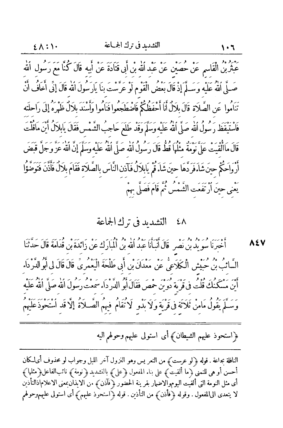 [848] ثُمَّ أُخَالِفُ إِلَى رِجَالٍ قَالَ فِي النِّهَايَةِ أَيْ آتِيهِمْ مِنْ خَلْفِهِمْ أَوْ أُخَالِفُ مَا أَظْهَرْتُ مِنْ إِقَامَةِ الصَّلَاةِ وَأَرْجِعُ إِلَيْهِمْ فَآخُذُهُمْ عَلَى غَفْلَةٍ أَوْ يَكُونُ بِمَعْنَى أَتَخَلَّفُ عَنِ الصَّلَاة بمعاقبتهم فَأحرق عَلَيْهِم بُيُوتهم قَالَ بن سَيِّدِ النَّاسِ اخْتَلَفَ الْعُلَمَاءُ فِي الصَّلَاةِ الَّتِي أَرَادَ رَسُولُ اللَّهِ صَلَّى اللَّهُ عَلَيْهِ وَسَلَّمَ إِحْرَاقَ بُيُوتَ الْمُتَخَلِّفِينَ عَنْهَا مَا هِيَ فَقِيلَ هِيَ صَلَاةُ الْعِشَاءِ وَقِيلَ الْعِشَاءُ أَوِ الْفَجْرُ وَقِيلَ الْجُمُعَةُ وَقِيلَ كُلُّ صَلَاةٍ وَاَلَّذِي نَفْسِي بِيَدِهِ لَوْ يَعْلَمُ أَحَدُهُمْ أَنَّهُ يَجِدُ عَظْمًا سَمِينًا أَوْ مِرْمَاتَيْنِ حَسَنَتَيْنِ لَشَهِدَ الْعِشَاءَ قَالَ فِي النِّهَايَةِ الْمِرْمَاةُ ظِلْفُ الشَّاةِ وَقِيلَ مَا بَيْنَ ظِلْفَيْهَا وَتُكْسَرُ مِيمُهُ وَتُفْتَحُ وَقِيلَ