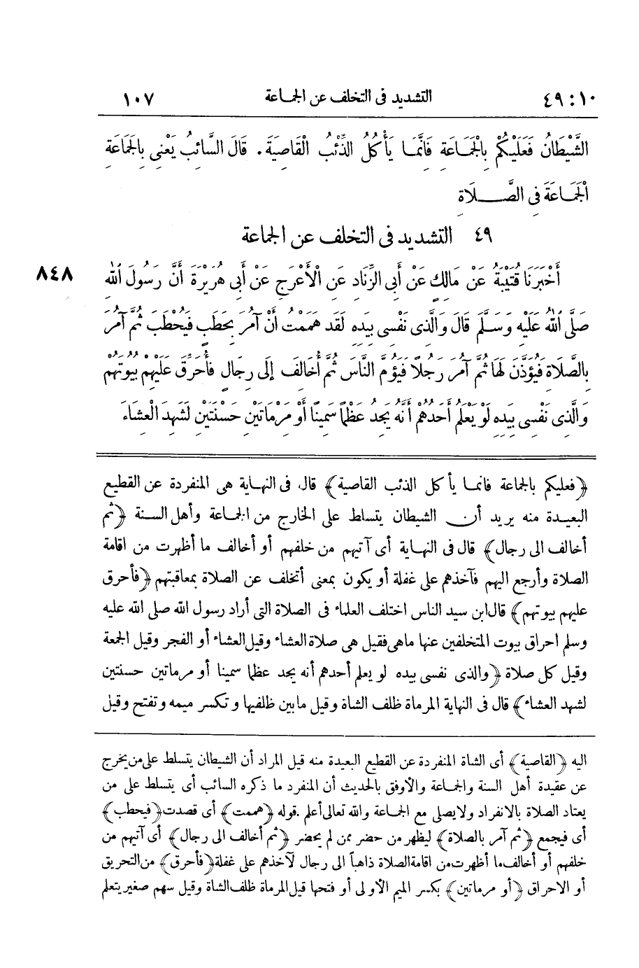 [847] استحوذ عَلَيْهِم أَي استولى عَلَيْهِم وحولهم إِلَيْهِ القاصية أَي الشَّاة المنفردة عَن القطيع الْبَعِيدَة مِنْهُ قيل المُرَاد أَن الشَّيْطَان يتسلط على من يخرج عَن عقيدة أهل السّنة وَالْجَمَاعَة والأوفق بِالْحَدِيثِ أَن الْمُنْفَرد مَا ذكره السَّائِب أَي يتسلط على من يعْتَاد الصَّلَاة بالانفراد وَلَا يُصَلِّي مَعَ الْجَمَاعَة وَالله تَعَالَى أعلم قَوْله هَمَمْت أَي قصدت فيحطب أَي فَيجمع ثمَّ آمُر بِالصَّلَاةِ ليظْهر من حضر مِمَّن لم يحضر ثمَّ أُخَالِف إِلَى رجال أَيْ آتِيهِمْ مِنْ خَلْفِهِمْ أَوْ أُخَالِفُ مَا أظهرت من إِقَامَة الصَّلَاة ذَاهِبًا إِلَى رجال لآخذهم على غَفلَة فَأحرق من التحريق أَو الاحراق أَو مرماتين بِكَسْر الْمِيم الأولى أَو فتحهَا قيل المرماة ظلف الشَّاة وَقيل سهم صَغِير يتَعَلَّم