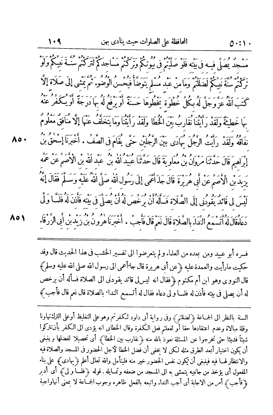 [850] عَنْ أَبِي هُرَيْرَةَ قَالَ جَاءَ أَعْمَى إِلَى رَسُول الله صلى الله عَلَيْهِ وَسلم قَالَ النَّوَوِيّ وَهُوَ بن أُمِّ مَكْتُومٍ فَقَالَ إِنَّهُ لَيْسَ لِي قَائِدٌ يَقُودُنِي إِلَى الصَّلَاةِ فَسَأَلَهُ أَنْ يُرَخِّصَ لَهُ أَنْ يُصَلِّيَ فِي بَيْتِهِ فَأَذِنَ لَهُ فَلَمَّا وَلَّى دَعَاهُ فَقَالَ لَهُ أَتَسْمَعُ النِّدَاءَ بِالصَّلَاةِ قَالَ نَعَمْ قَالَ فَأَجِبْ