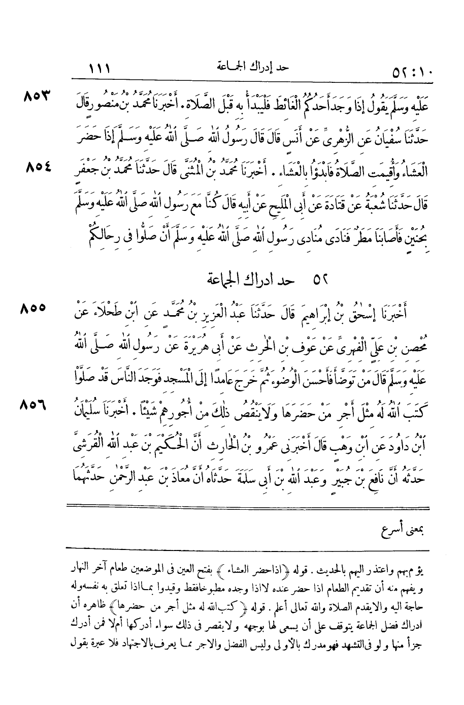 [855] كَتَبَ اللَّهُ لَهُ مِثْلَ أَجْرِ مَنْ حَضَرَهَا ظَاهره أَن أَدْرَاك فضل الْجَمَاعَة يتَوَقَّف على أَن يسْعَى لَهَا بِوَجْهِهِ وَلَا يقصر فِي ذَلِك سَوَاء أدْركهَا أم لَا فَمن أدْرك جزأ مِنْهَا وَلَو فِي التَّشَهُّد فَهُوَ مدرك بِالْأولَى وَلَيْسَ الْفضل والاجر مِمَّا يعرف بِالِاجْتِهَادِ فَلَا عِبْرَة بقول