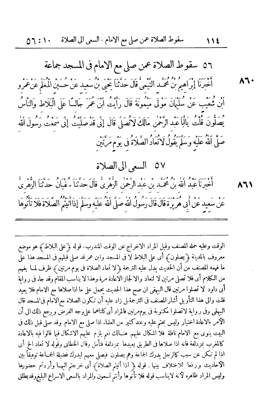 [860] على البلاط هُوَ مَوضِع مَعْرُوف بِالْمَدِينَةِ يصلونَ أَي على البلاط لَا فِي الْمَسْجِد وبن عمر قد صلى قبلهم فِي الْمَسْجِد هَذَا على مَا فهمه المُصَنّف من أَن الحَدِيث يدل عَلَيْهِ التَّرْجَمَة لَا تُعَاد الصَّلَاة فِي يَوْم مرَّتَيْنِ ظرف لما يفهم من الْكَلَام أَي فَلَا تصلى مرَّتَيْنِ لَا لتعاد والا لجَاز الْإِعَادَة مرّة وَهَذَا لَا يُنَاسب الْمقَام وَقد جَاءَ فِي رِوَايَة أبي دَاوُد لَا تصلوا مرَّتَيْنِ قَالَ الْبَيْهَقِيّ ان صَحَّ هَذَا الحَدِيث يحمل على مَا إِذا صلاهَا مَعَ الامام فَلَا يُعِيد قلت والى هَذَا التَّأْوِيل أَشَارَ المُصَنّف فِي التَّرْجَمَة بل زَاد عَلَيْهِ أَن تكون الصَّلَاة مَعَ الامام فِي الْمَسْجِد قَالَ الْبَيْهَقِيّ وَفِي رِوَايَة لَا تصلوا مَكْتُوبَة فِي يَوْم مرَّتَيْنِ فَالْمُرَاد أَي كلتاهما على وَجه الْفَرْض وَيرجع ذَلِك إِلَى أَن الْأَمر بِالْإِعَادَةِ اخْتِيَار وَلَيْسَ بحتم عَلَيْهِ وَعند كثير من الْعلمَاء إِذا صلى مَعَ الامام وَقد صلى قبل ذَلِك فِي الْبَيْت يَنْوِي مَعَ الامام نَافِلَة فَلَا اشكال عَلَيْهِم هُنَالك نعم يلْزم عَلَيْهِم الاشكال فِيمَا قَالُوا فِيهِ بِالْإِعَادَةِ كالمغرب بِمُزْدَلِفَة فَإِنَّهُ إِذا صلاهَا فِي الطَّرِيق يُعِيدهَا بِمُزْدَلِفَة فَتَأمل وَقَالَ الْخطابِيّ وَقَوله لَا تُعَاد الخ أَي إِذا لم تكن عَن سَبَب كَالرّجلِ يدْرك الْجَمَاعَة وهم يصلونَ فيصلى مَعَهم ليدرك فَضِيلَة الْجَمَاعَة تَوْفِيقًا بَين الْأَحَادِيث ورفعا للِاخْتِلَاف بَينهَا