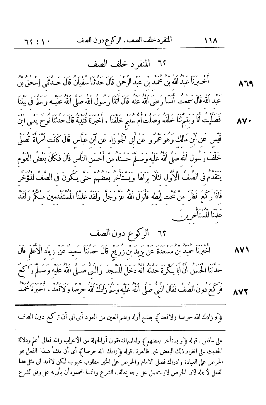 [871] وَزَادَكَ اللَّهُ حِرْصًا وَلَا تَعُدْ بِفَتْحِ أَوَّلِهِ وَضَمِّ الْعَيْنِ مِنَ الْعَوْدِ أَيْ إِلَى أَنْ تَرْكَعُ دُونَ الصَّفِّ حَتَّى تَقُومَ فِي الصَّفِّ وَقِيلَ مَعْنَاهُ لَا تَعُدْ إِلَى أَنْ تَسْعَى إِلَى الصَّلَاةِ سَعْيًا بِحَيْثُ يَضِيقُ عَلَيْكَ النَّفْسُ وَقِيلَ لَا تَعُدْ إِلَى الْإِبْطَاءِ وَقَالَ الْبَيْضَاوِيُّ يَحْتَمِلُ أَنْ يَكُونَ عَائِدًا إِلَى الْمَشْي إِلَى الصَّفِّ فِي الصَّلَاةِ فَإِنَّ الْخُطْوَةَ وَالْخُطْوَتَيْنِ وَإِنْ لَمْ تُفْسِدِ الصَّلَاةَ لَكِنَّ الْأَوْلَى التَّحَرُّزُ عَنْهَا