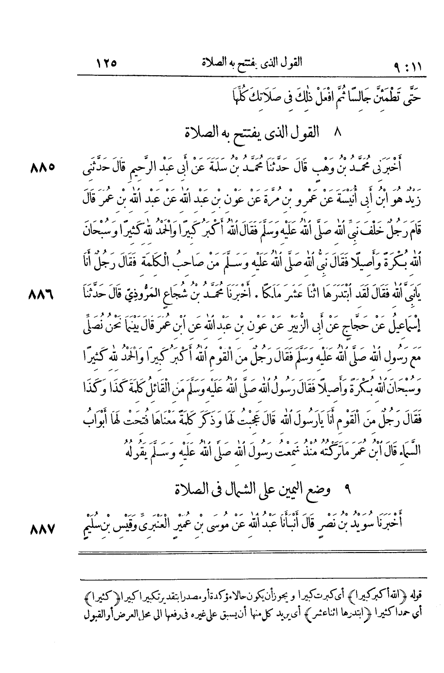 [885] الله أكبر كَبِيرا أَي كَبرت كَبِيرا وَيجوز أَن يكون حَالا مُؤَكدَة أَو مصدرا بِتَقْدِير تَكْبِيرا كَبِيرا كثيرا أَي حمدا كثيرا ابتدرها اثْنَا عشر أَي يُرِيد كل مِنْهَا أَن يسْبق على غَيره فِي رَفعهَا إِلَى مَحل الْعرض أَو الْقبُول قَوْله قبض بِيَمِينِهِ الخ الْأَحَادِيث الدَّالَّة على أَن السّنة هِيَ الْوَضع دون الْإِرْسَال كَثِيرَة شهيرة قَوْله
