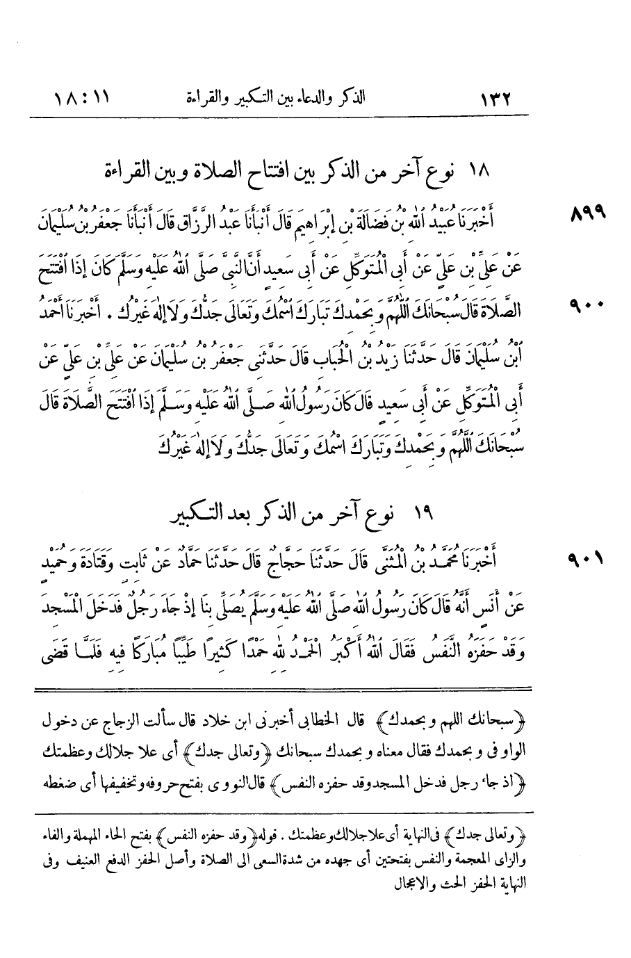 [899] سُبْحَانَكَ اللَّهُمَّ وَبِحَمْدِك قَالَ الْخطابِيّ أَخْبرنِي بن خَلَّادٍ قَالَ سَأَلْتُ الزَّجَّاجَ عَنْ دُخُولِ الْوَاوِ فِي وَبِحَمْدِكَ فَقَالَ مَعْنَاهُ وَبِحَمْدِكَ سُبْحَانَكَ وَتَعَالَى جدك أَي علا جلالك وعظمتك