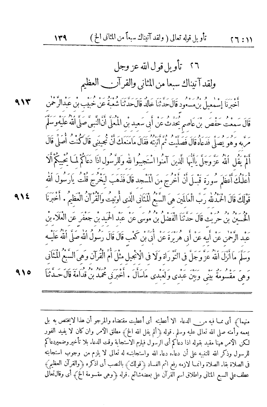 [913] ألم يقل الله الخ مُطلق الْأَمر وان كَانَ لَا يُفِيد الْفَوْر لَكِن الْأَمر هَا هُنَا مُقَيّد بقوله إِذا دعَاكُمْ أَي الرَّسُول فَيلْزم الاستجابة وَقت الدُّعَاء بِلَا تَأْخِير وَضمير دعَاكُمْ للرسول وَذكر الله للتّنْبِيه على أَن دعاءه دُعَاء الله واستجابته لَهُ تَعَالَى لَا يلْزم من وجوب استجابته فِي الصَّلَاة بَقَاء الصَّلَاة وَإِنَّمَا لَازمه رفع اثم الْفساد قَوْلك بِالنّصب أَي أذكرهُ وَالْقُرْآن الْعَظِيم عطف على السَّبع المثاني وَإِطْلَاق اسْم الْقُرْآن على بعضه شَائِع قَوْله وَهِي مقسومة الخ أَي وَقَالَ تَعَالَى هِيَ مقسومة الخ قَوْله الطول بِضَم الطَّاء وَفتح وَاو جمع الطولي السِّتَّة مَعْلُومَة وَالسَّابِعَة هِيَ سُورَة التَّوْبَة وَقيل غَيرهَا وَالله تَعَالَى أعلم