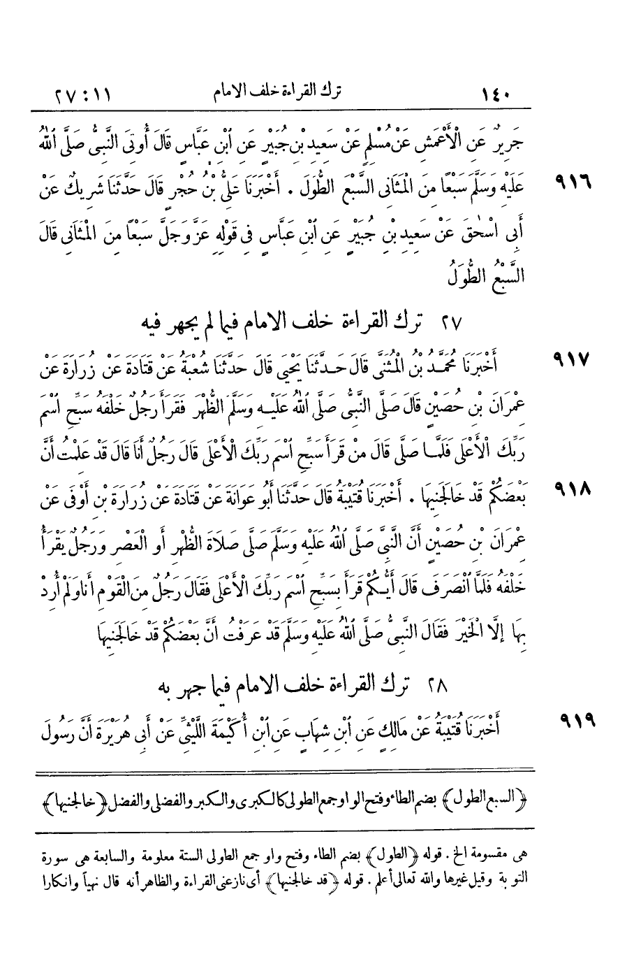 [915] السَّبع الطول بِضَم الطَّاء وَفتح الْوَاو جمع الطُّولى كالكبرى وَالْكبر والفضلى وَالْفضل خالجنيها أَي نازعنيها