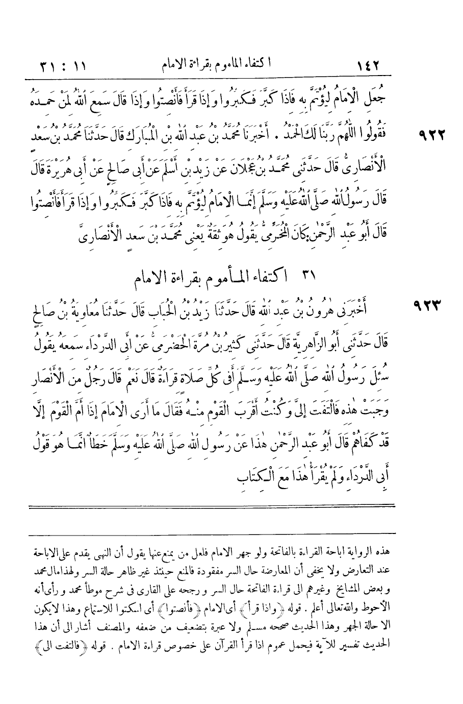 [921] وَإِذا قَرَأَ أَي الامام فأنصتوا أَي اسْكُتُوا للاستماع وَهَذَا لَا يكون الا حَالَة الْجَهْر وَهَذَا الحَدِيث صَححهُ مُسلم وَلَا عِبْرَة بِتَضْعِيف من ضعفه وَالْمُصَنّف أَشَارَ إِلَى أَن هَذَا الحَدِيث تَفْسِير لِلْآيَةِ فَيحمل عُمُوم إِذا قَرَأَ الْقُرْآن على خُصُوص قِرَاءَة الامام