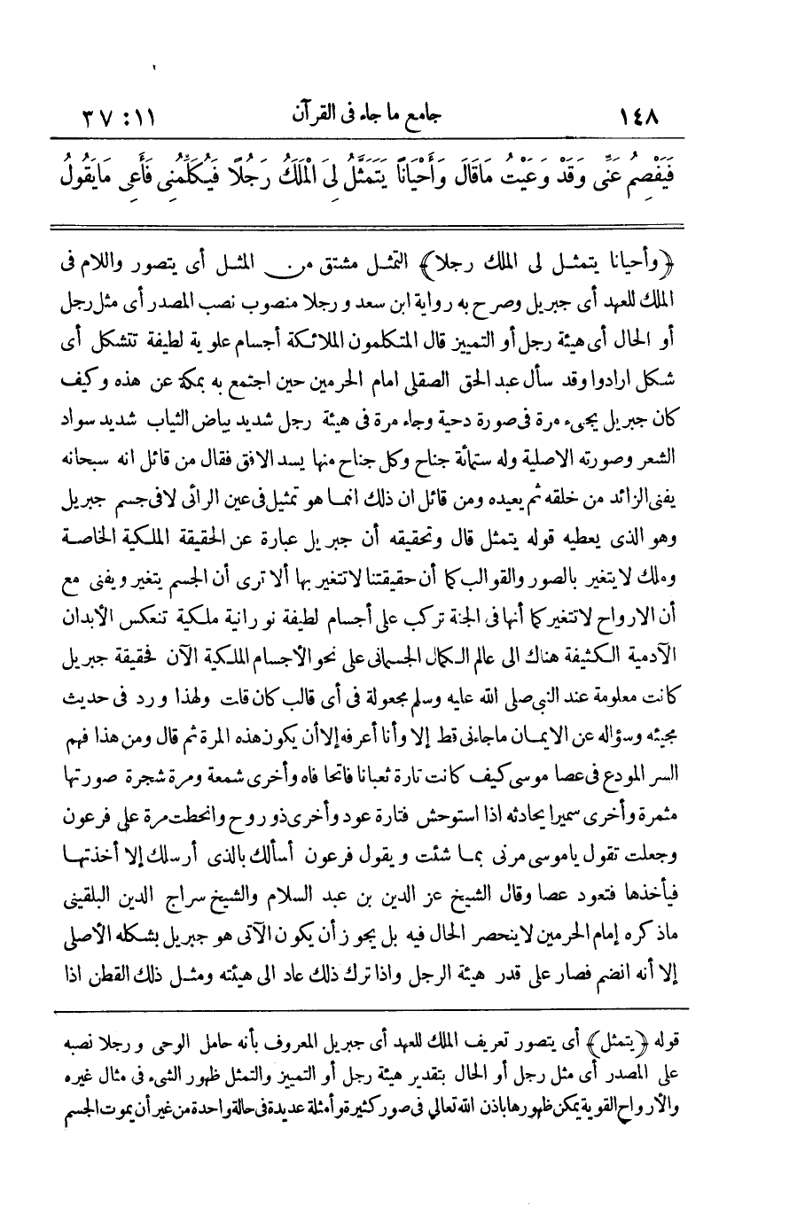 [934] وَأَحْيَانًا يَتَمَثَّلُ لِي الْمَلَكُ رَجُلًا التَّمَثُّلُ مُشْتَقٌّ مِنَ الْمِثْلِ أَيْ يَتَصَوَّرُ وَاللَّامُ فِي الْمَلَكِ للْعهد أَي جِبْرِيل وَصرح بِهِ رِوَايَة بن سَعْدٍ وَرَجُلًا مَنْصُوبٌ نَصْبَ الْمَصْدَرِ أَيْ مِثْلَ رَجُلٍ أَوِ الْحَالِ أَيْ هَيْئَةَ رَجُلٍ أَوِ التَّمْيِيزِ قَالَ الْمُتَكَلِّمُونَ الْمَلَائِكَةُ أَجْسَامٌ عُلْوِيَّةٌ لَطِيفَةٌ تَتَشَكَّلُ أَيْ شَكْلٍ أَرَادُوا وَقَدْ سَأَلَ عَبْدُ الْحَقِّ الصِّقِلّيُّ إِمَامَ الْحَرَمَيْنِ حِينَ اجْتَمَعَ بِهِ بِمَكَّةَ عَنْ هَذِهِ وَكَيْفَ كَانَ جِبْرِيلُ يَجِيءُ مَرَّةً فِي صُورَةِ دِحْيَةَ وَجَاءَ مَرَّةً فِي هَيْئَةِ رَجُلٍ شَدِيدِ بَيَاضِ الثِّيَابِ شَدِيدِ سَوَادِ الشَّعْرِ وَصُورَتُهُ الْأَصْلِيَّةُ وَلَهُ سِتُّمِائَةُ جَنَاحٍ وَكُلُّ جَنَاحٍ مِنْهَا يَسُدُّ الْأُفُقَ فَقَالَ مِنْ قَائِلٍ إِنَّهُ سُبْحَانَهُ يُفْنِي الزَّائِدَ مِنْ خَلْقِهِ ثُمَّ يُعِيدُهُ وَمِنْ قَائِلٍ إِنَّ ذَلِكَ إِنَّمَا هُوَ تَمْثِيلٌ فِي عَيْنِ الرَّائِي لَا فِي جِسْمِ جِبْرِيلَ وَهُوَ الَّذِي يُعْطِيهِ قَوْلُهُ يَتَمَثَّلُ قَالَ وَتَحْقِيقُهُ أَنَّ جِبْرِيلَ عِبَارَةٌ عَنِ الْحَقِيقَةِ الْمَلَكِيَّةِ الْخَاصَّةِ وَمَلَكٌ لَا يَتَغَيَّرُ بِالصُّوَرِ وَالْقَوَالِبِ كَمَا أَنَّ حَقِيقَتَنَا لَا تَتَغَيَّرُ بِهَا أَلَا تَرَى أَنَّ الْجِسْمَ يَتَغَيَّرُ وَيَفْنَى مَعَ أَنَّ الْأَرْوَاحَ لَا تَتَغَيَّرُ كَمَا أَنَّهَا فِي الْجَنَّةِ تُرَكَّبُ عَلَى أَجْسَامٍ لَطِيفَةٍ نُورَانِيَّةٍ مَلَكِيَّةٍ تَنْعَكِسُ الْأَبْدَانُ الْآدَمِيَّةُ الْكَثِيفَةُ هُنَاكَ إِلَى عَالَمِ الْكَمَالِ الْجُسْمَانِيِّ عَلَى نَحْوِ الْأَجْسَامِ الْمَلَكِيَّةِ الْآنَ فَحَقِيقَةُ جِبْرِيلَ كَانَتْ مَعْلُومَةً عِنْدَ النَّبِيِّ صَلَّى اللَّهُ عَلَيْهِ وَسَلَّمَ مَجْعُولَةً فِي أَيِّ قَالِبٍ كَانَ قُلْتُ وَلِهَذَا وَرَدَ فِي حَدِيثِ مَجِيئِهِ وَسُؤَالِهِ عَنِ الْإِيمَانِ مَا جَاءَنِي قَطُّ إِلَّا وَأَنَا أَعْرِفُهُ إِلَّا أَنْ يَكُونَ هَذِهِ الْمَرَّةَ ثُمَّ قَالَ وَمِنْ هَذَا فُهِمَ السِّرُّ الْمُودَعُ فِي عَصَا مُوسَى كَيْفَ كَانَتْ تَارَةً ثُعْبَانًا فَاتِحًا فَاهُ وَأُخْرَى شَمْعَةً وَمَرَّةً شَجَرَةً صُورَتُهَا مُثْمِرَةٌ وَأُخْرَى سَمِيرًا يُحَادِثُهُ إِذَا اسْتَوْحَشَ فَتَارَةً عُودٌ وَأُخْرَى ذُو رُوحٍ وَانْحَطَّتْ مَرَّةً عَلَى فِرْعَوْنَ وَجَعَلَتْ تَقُولُ يَا مُوسَى مُرْنِي بِمَا شِئْتَ وَيَقُولُ فِرْعَوْنُ أَسْأَلُكَ بِاَلَّذِي أَرْسَلَكَ إِلَّا أَخَذْتَهَا فَيَأْخُذُهَا فَتَعُودُ عَصَا وَقَالَ الشَّيْخُ عِزُّ الدِّينِ بْنُ عَبْدِ السَّلَامِ وَالشَّيْخُ سِرَاجُ الدِّينِ الْبُلْقِينِيُّ مَا ذَكَرَهُ إِمَامُ الْحَرَمَيْنِ لَا يَنْحَصِرُ الْحَالُ فِيهِ بَلْ يَجُوزُ أَنْ يَكُونَ الْآتِي هُوَ جِبْرِيلُ بِشَكْلِهِ الْأَصْلِيِّ إِلَّا أَنَّهُ انْضَمَّ فَصَارَ عَلَى قَدْرِ هَيْئَةِ الرَّجُلِ وَإِذَا تَرَكَ ذَلِكَ عَادَ إِلَى هَيْئَتِهِ وَمِثْلُ ذَلِكَ الْقُطْنُ إِذَا