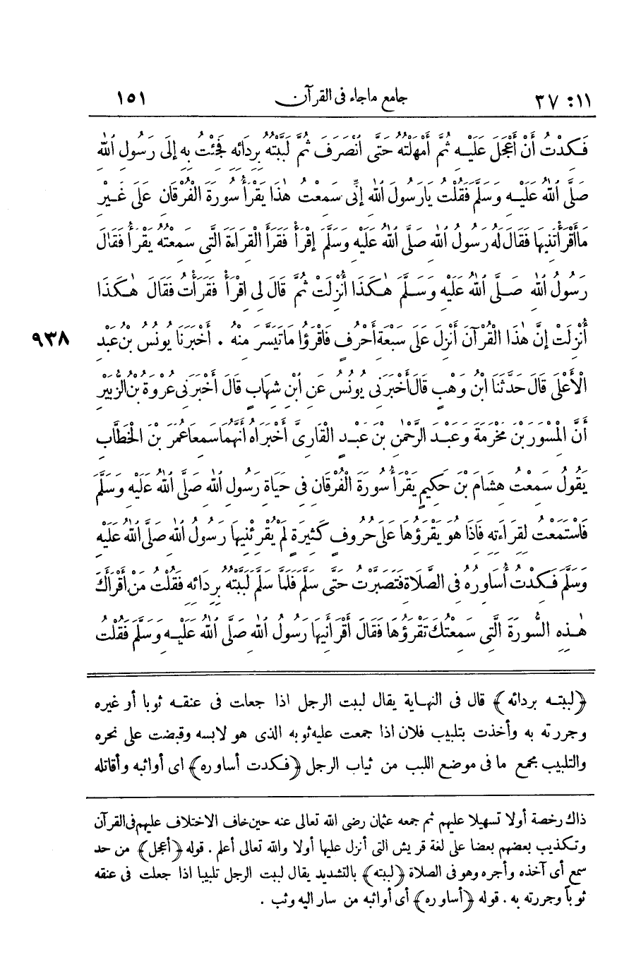 [938] فَكِدْتُ أُسَاوِرُهُ أَيْ أُوَاثِبُهُ وَأُقَاتِلُهُ إِنَّ هَذَا الْقُرْآنَ أُنْزِلَ عَلَى سَبْعَةِ أَحْرُفٍ وَالْمُرَادُ بِهِ أَكْثَرُ مِنْ ثَلَاثِينَ قَوْلًا حَكَيْتُهَا فِي الِاتِّفَاقِ وَالْمُخْتَارُ عِنْدَي أَنَّهُ مِنَ الْمُتَشَابِهِ الَّذِي لَا يُدْرَى تَأْوِيلُهُ