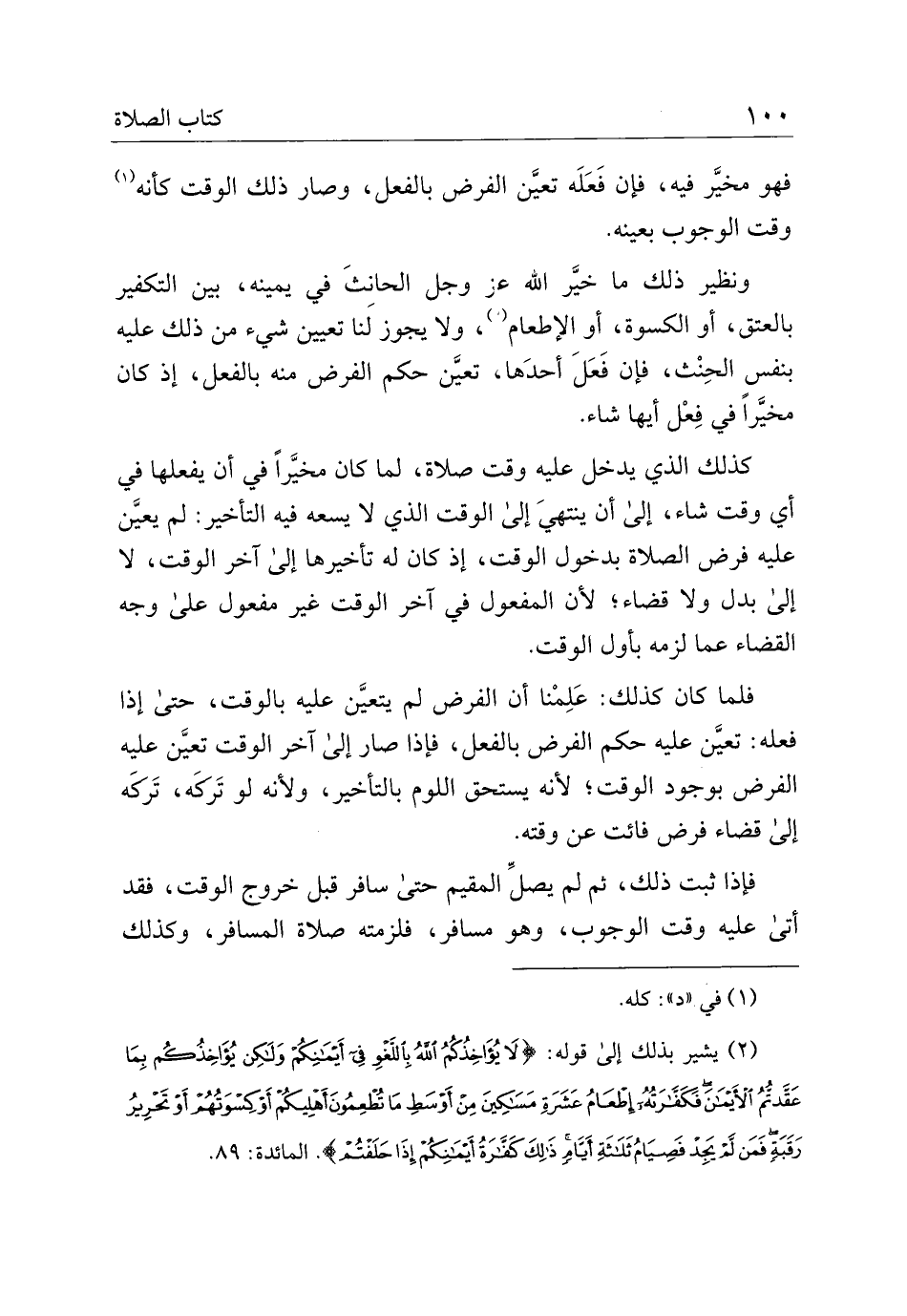 كذلك الذي يدخل عليه وقت صلاة، لما كان مخيرًا في أن يفعلها في أي وقت شاء، إلى ان ينتهي إلى الوقت الذي لا يسعه فيه التأخير: لمي عين عليه فرض الصلاة بدخول الوقت، إذ كان له تأخيرها إلى آخر الوقت، لا إلى بدل ولا قضاء؛ لأن المفعول في آخر الوقت غير مفعول على وجه القضاء عما لزمه بأول الوقت.