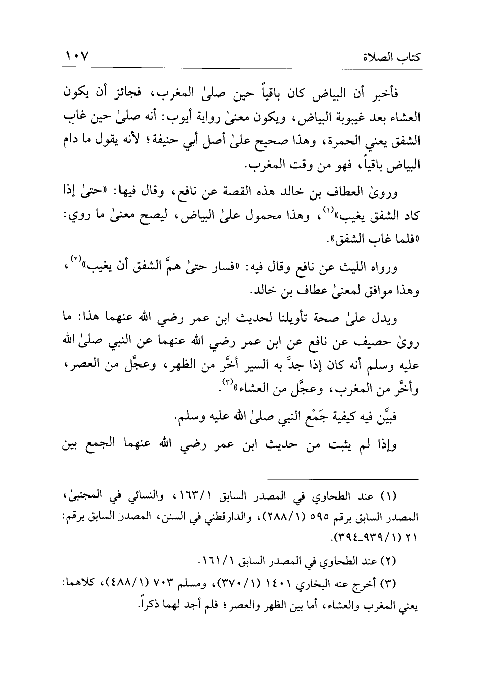 فأخبر أن الباض كان باقيًا حين صلى المغرب، فجائز أن يكون العشاء بعد غيبوبة البياض، ويكون معنى رواية أيوب: أنه صلى حين غاب الشفق يعني الحمرة، وهذا صحيح على أصل أبي حنيفة؛ لأنه يقول ما دام الباض باقيًا، فهو من وقت المغرب.