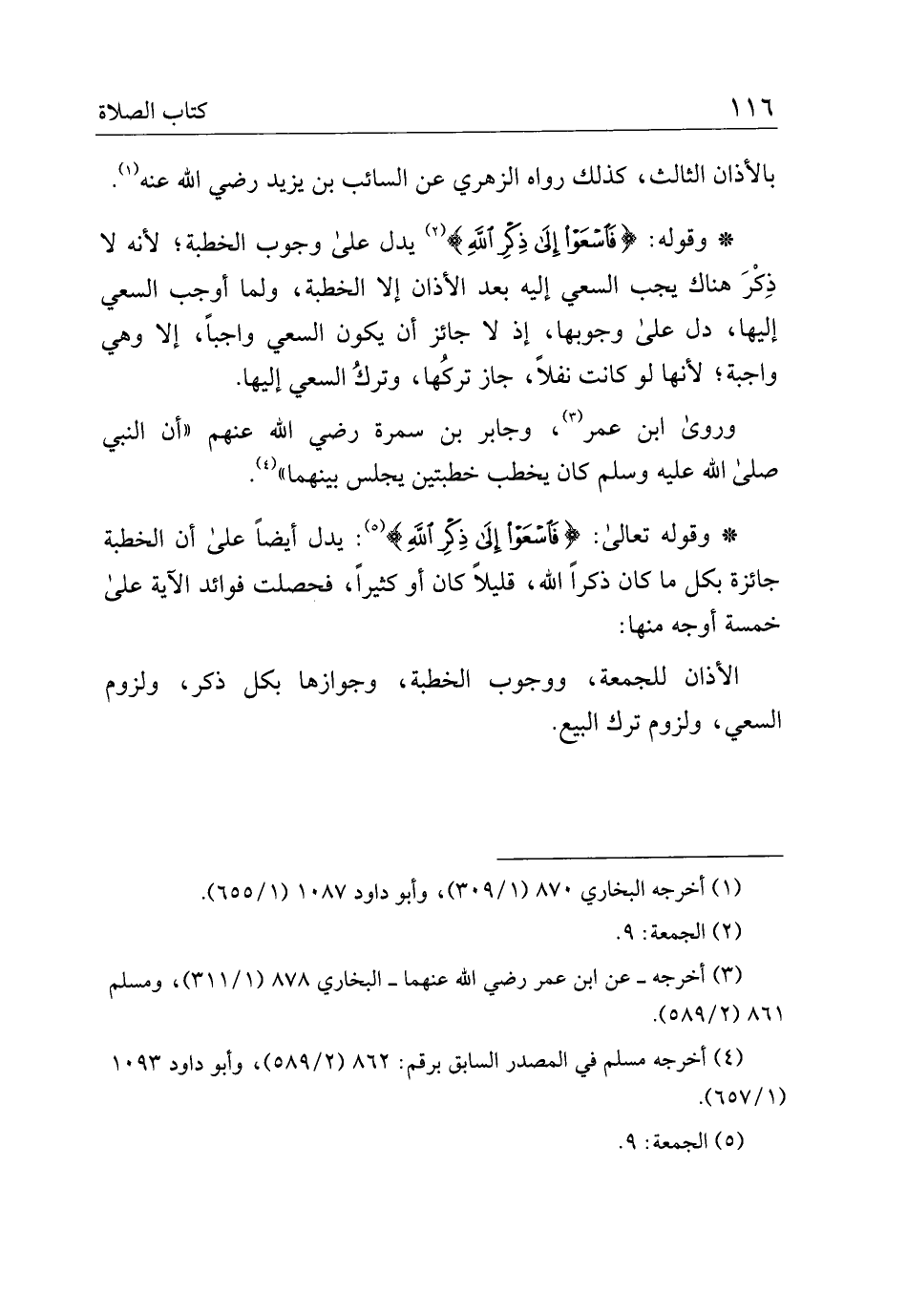 * وقوله: (فاسعوا إلى ذكر الله) يدل على وجوب الخطبة: لأنه لا ذكر هناك يجب السعي إليه بعد الأذان إلا الخطبة، ولما أوجب السعي إليها، دل على وجوبها، إذ لا جائز أن يكون السعي واجبًا، إلا وهي واجبة؛ لأنها لو كانت نفلاً، جاز تركها، وترك السعي إليها.