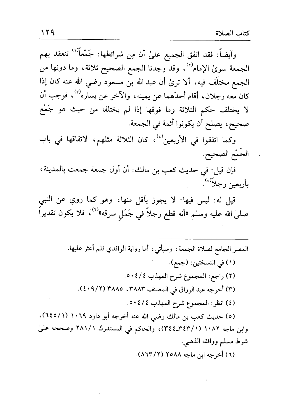 وأيضًا: فقد اتفق الجميع على أن من شرائطها: جمعًا تنعقد بهم الجمعة سوى الإمام، وقد وجدنا الجمع الصحيح ثلاثة، وما دونها من الجمع مختلف فيه، ألا ترى أن عبد الله بن مسعود رضي الله عنه كان إذا كان معه رجلان، أقام أحدهما عن يمينه، والآخر عن يساره، فوجب أن لا يختلف حكم الثلاثة وما فوقها إذا لم يختلفا من حيث هو جمع صحيح، يصلح أن يكونوا أئمة في الجمعة.