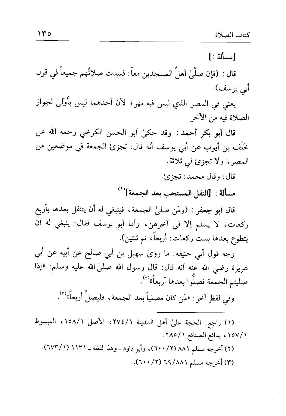 قال أبو جعفر: (ومن صلى الجمعة، فينبغي له أن ينتقل بعدها بأربع ركعات، لا يسلم إلا في آخرهن، وأما أبو يوسف فقالك ينبغي له أن يتطوع بعدها بست ركعات: أربعًا، ثم ثنتين).