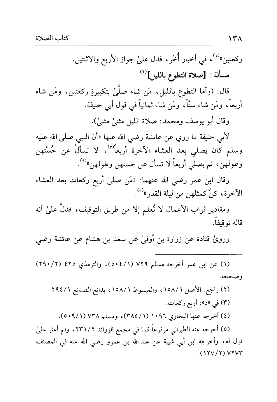 قال: (وأما التطوع بالليل، من شاء صلى بتكبيره ركعتين، ومن شاء أربعًا، ومن شاء سنًا، ومن شاء ثمانيًا في قول أبي حنيفة".