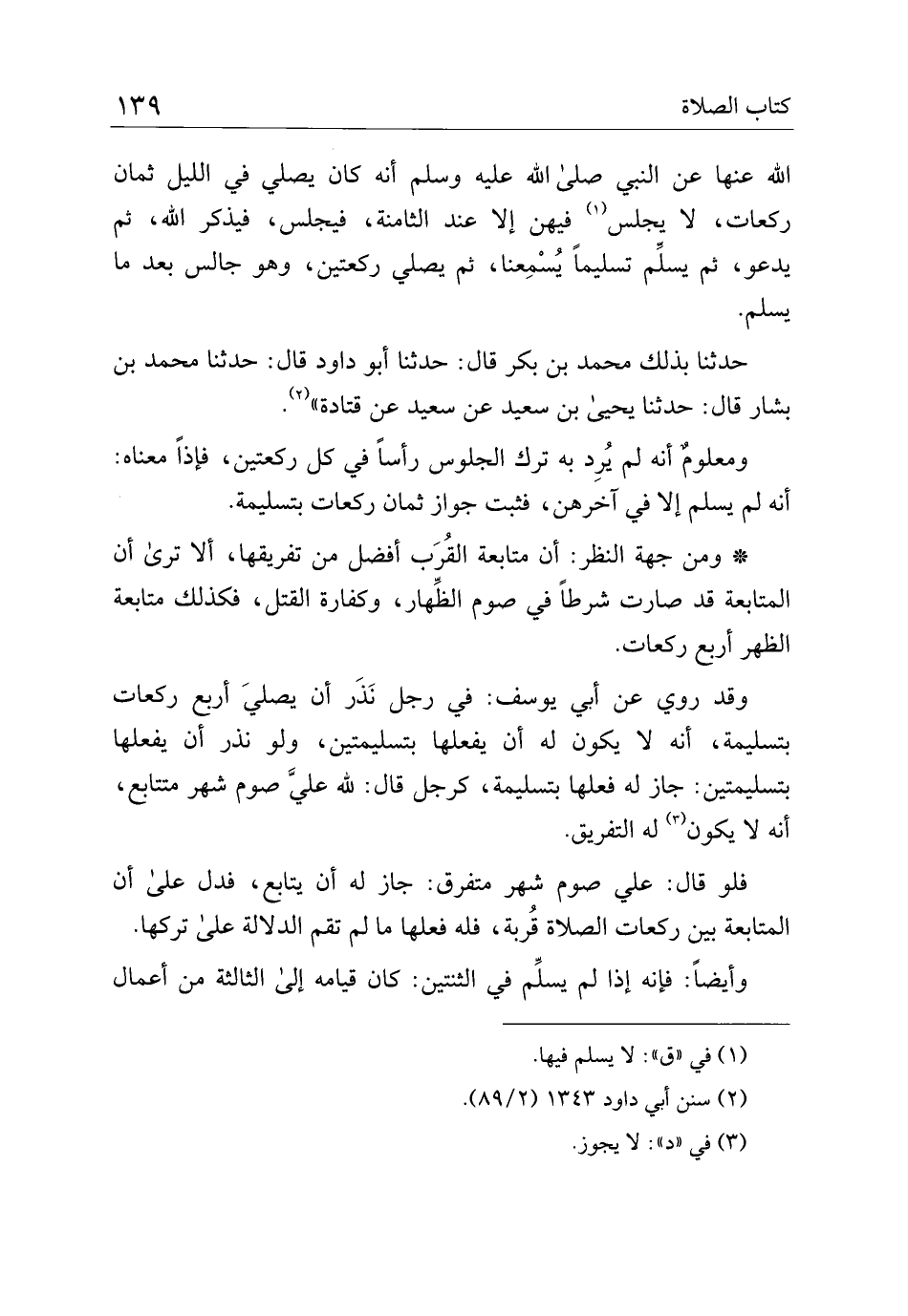 ومعلوم أنه لم يرد به ترك الجلوس رأسًا في كل ركعتين، فإذا معناه: أنه لم يسلم إلا في آخرهن، فثبت جواز ثمان ركعات بتسليمه.
