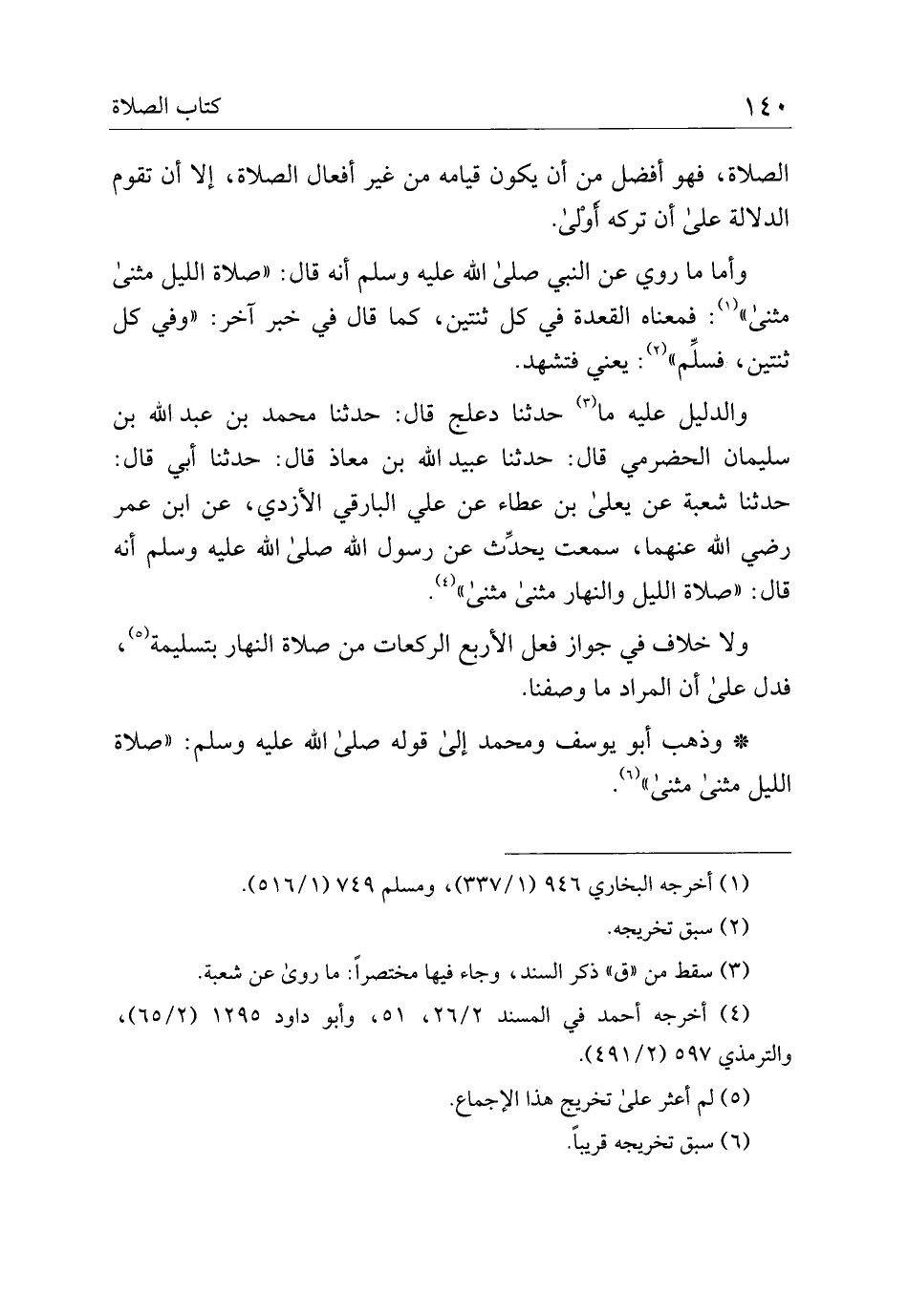 والدليل عليه ما حدثنا دعلج قال: حدثنا محمد بن عبد الله بن سليمان الحضرمي قال: حدثنا عبيد الله بن معاذ قال: حدثنا أبي قال: حدثنا شعبة عن يعلى بن عطاء عن علي البارقي الأزدي، عن ابن عمر رضي الله عنهما، سمعت يحدث عن رسول الله ص أنه قال: "صلاة الليل والنهار مثنى مثنى".