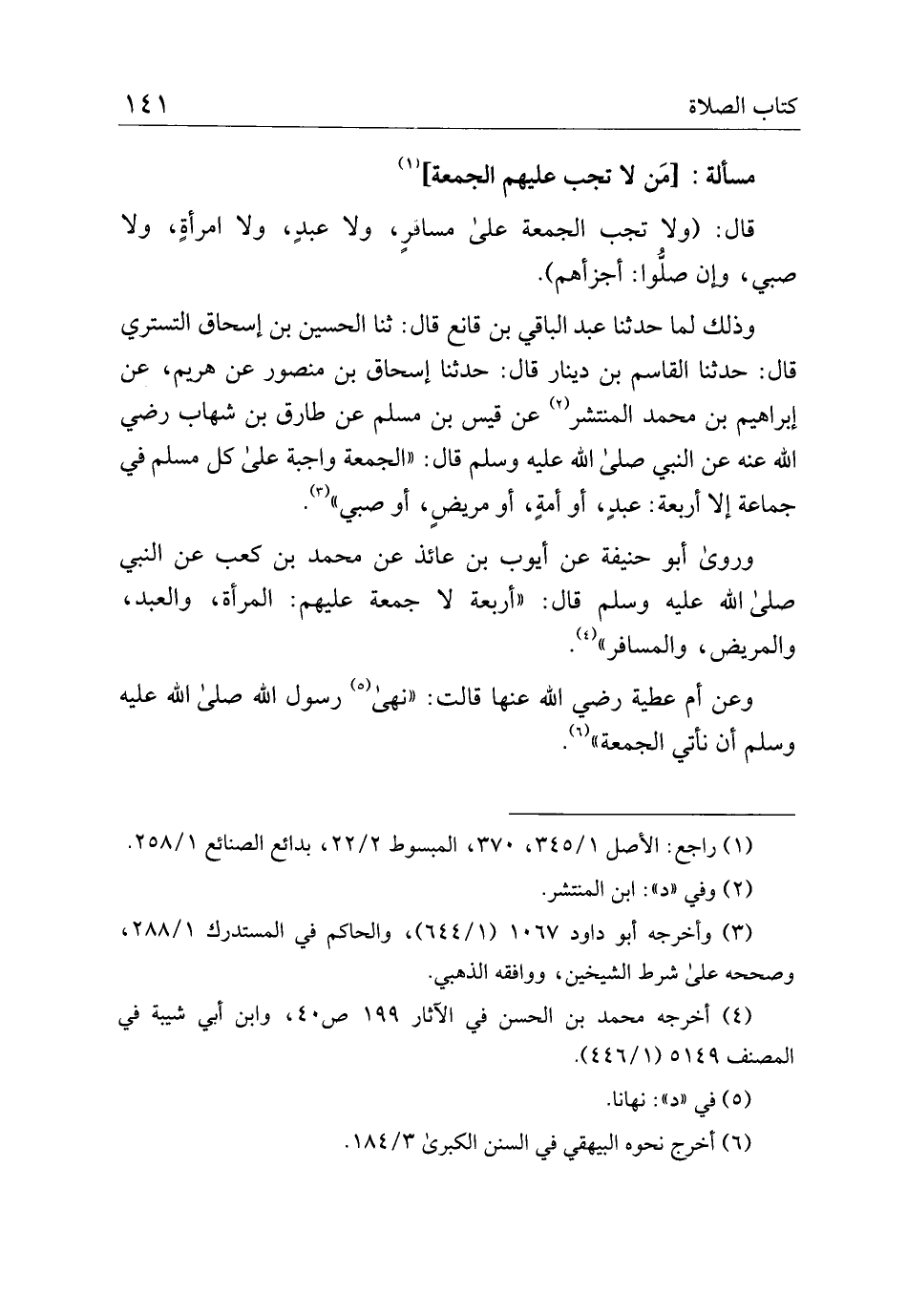 وذلك لما حدثنا عبد الباقي بن قانع قال: ثناء الحسين بن إسحاق التستري قال: حدثنا القاسم بن دينار قال: حدثنا إسحاق بن منصور عن هريم، عن إبراهيم بن محمد المنتشر عن قيس بن مسلم عن طارق بن شهاب رضي الله عنه عن النبي صلى الله عليه وسلم قال: "الجمعة واجبة على كل مسلم في جماعة إلا أربعة: عبد، أو أمة، أو مريض، أو صبي".