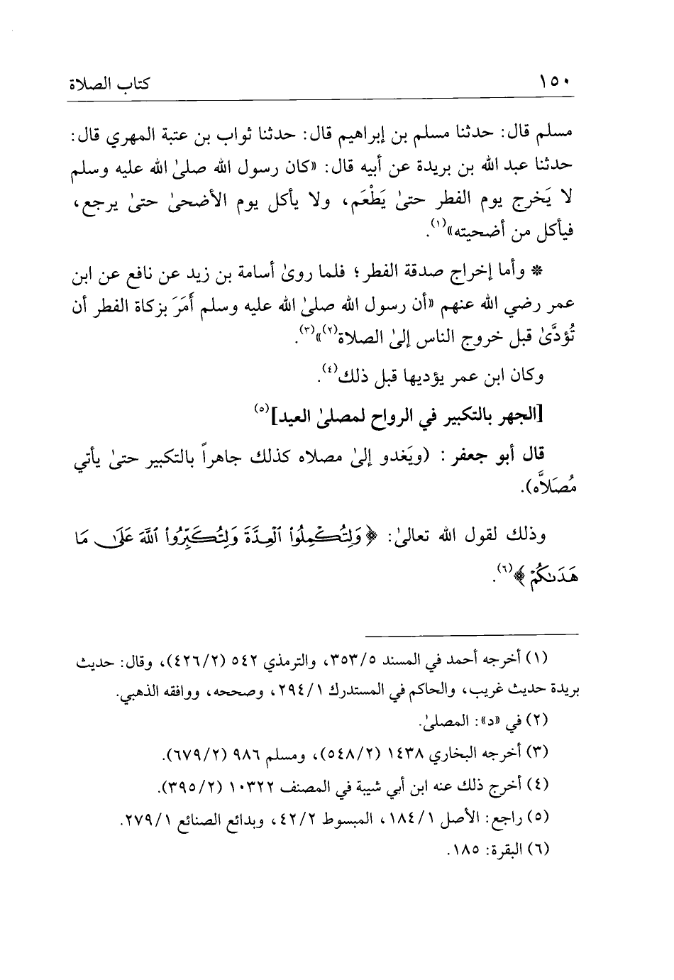 مسلم قال: حدثنا مسلم بن إبراهيم قال: حدثنا ثواب بن عتبة المهري قال: حدثنا عبد الله بن بريدة عن أبيه قال: "كان رسول الله صلى الله عليه وسلم لا يخرج يوم الفطر حتى يطعم، ولا يأكل يوم الأضحى حتى يرجع، فيأكل من أضحيته".