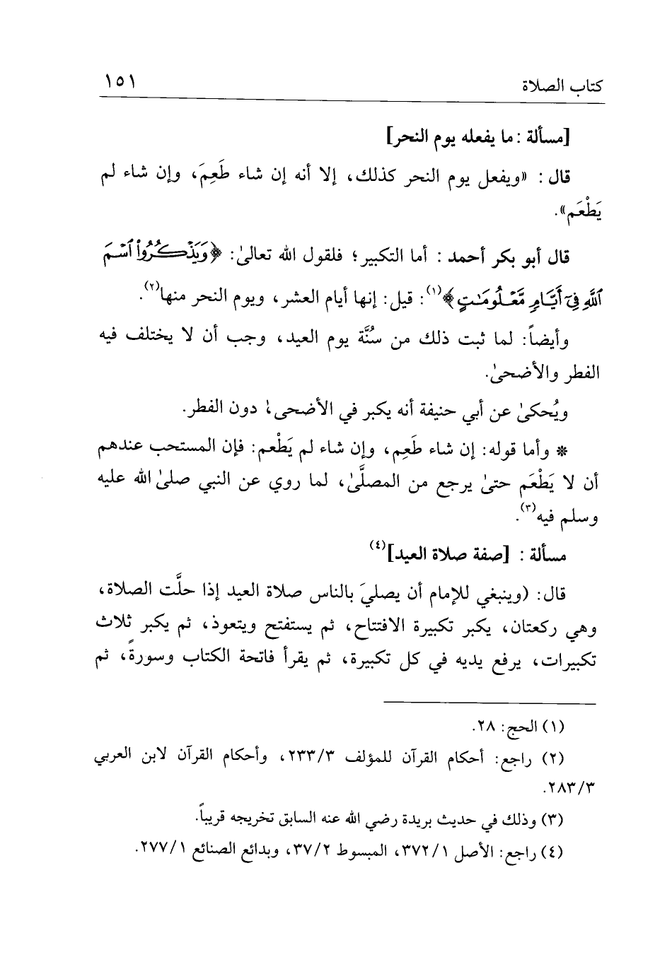 قال: (وينبغي للإمام أني صلي بالناس صلاة العيد إذا حلت الصلاة، وهي ركعتان، يكبر تكبيرة الافتتاح، ثم يستفتح ويتعوذ، ثم يكبر ثلاث تكبيرات، يرفع يديه في كل تكبيرة، ثم يقرأ فاتحة الكتاب سورة، ثم