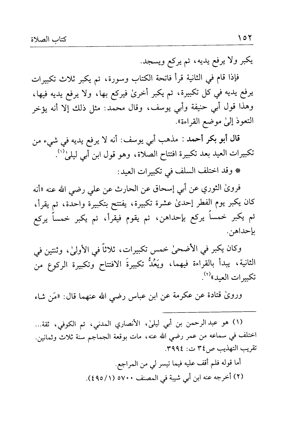 وكان يكبر في الأضحى خمس تكبيرات، ثلاثًا في الأولى، وثنتين في الثانية، يبدأ بالقراءة فيهما، ويعد تكبيرة الافتتاح وتكبيرة الركوع من تكبيرات العيد".