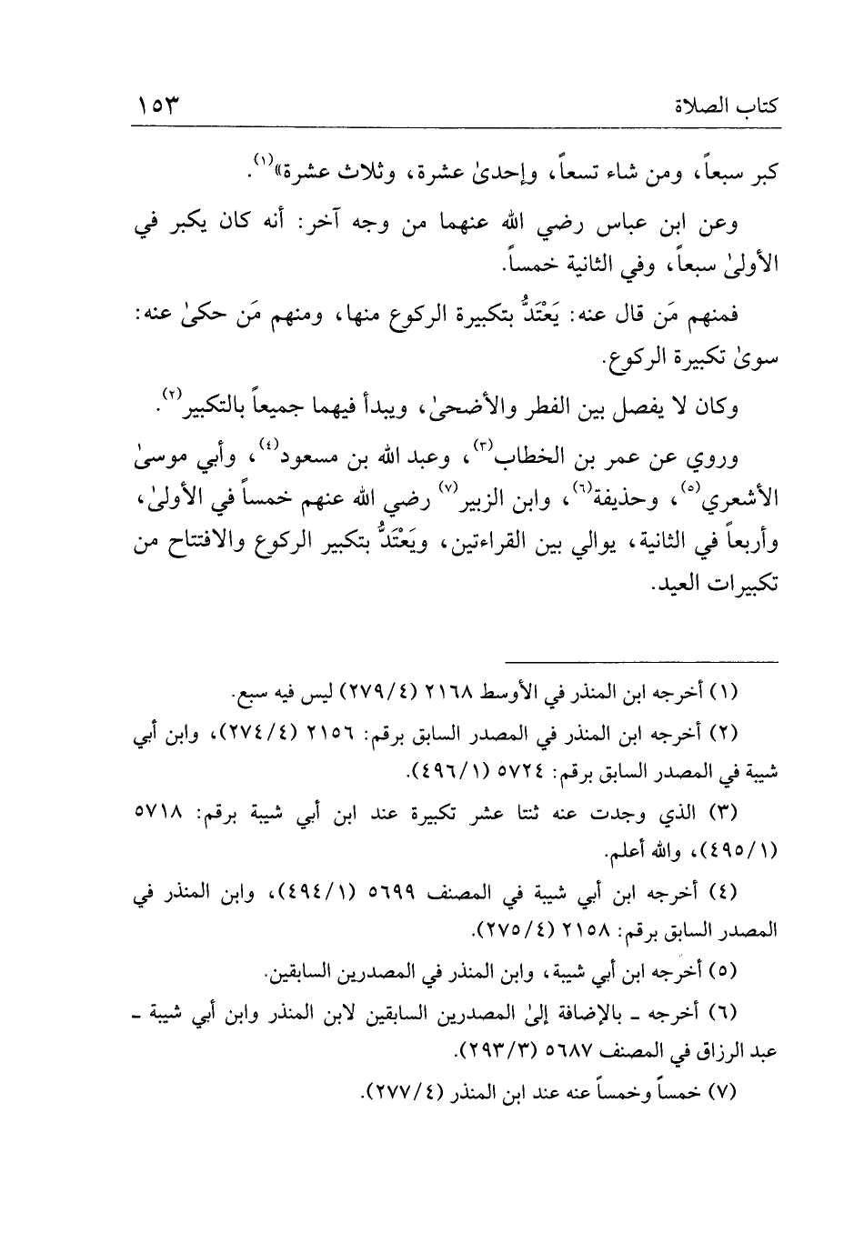 وروى عن عمر بن الخطاب، وعبد الله بن مسعود، وأبي موسى الأشعري، وحذيفة، وابن الزبير، رضي الله عنهم خمسًا في الأولى، وأربعًا في الثانية، يوالي بني القراءتين، ويعتد بتكبير الركوع والافتتاح من تكبيرات العيد.