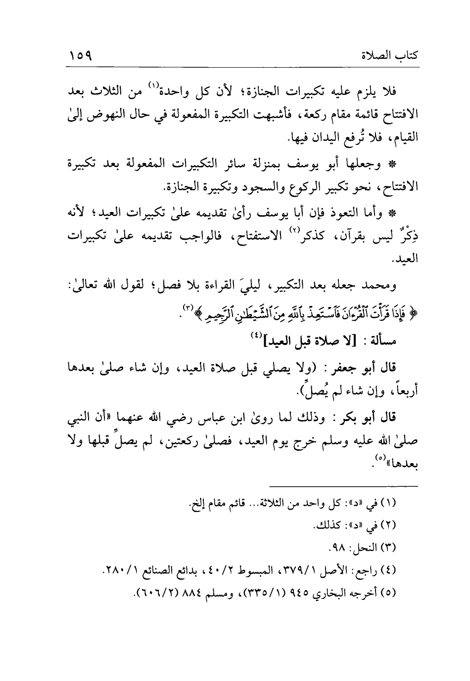 * وأما التعوذ فإن أبا يوسف رأى تقديمه عل تكبيرات العيد؛ لأنه ذكر ليس بقرآن، كذكر الاستفتاح، فالواجب تقديمه عل تكبيرات العيد.