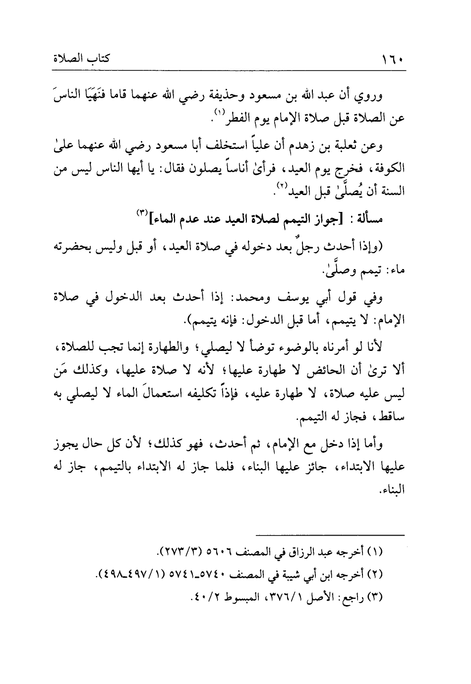 وعن ثعلبة بن زهدم أن عليًا استخلف أبا سمعود رضي الله عنهما على الكوفة، فخرج يوم العيد، فرأى أناسًا يصلون فقال: يا أيها الناس ليس من السنة أن يصلي قبل العيد.