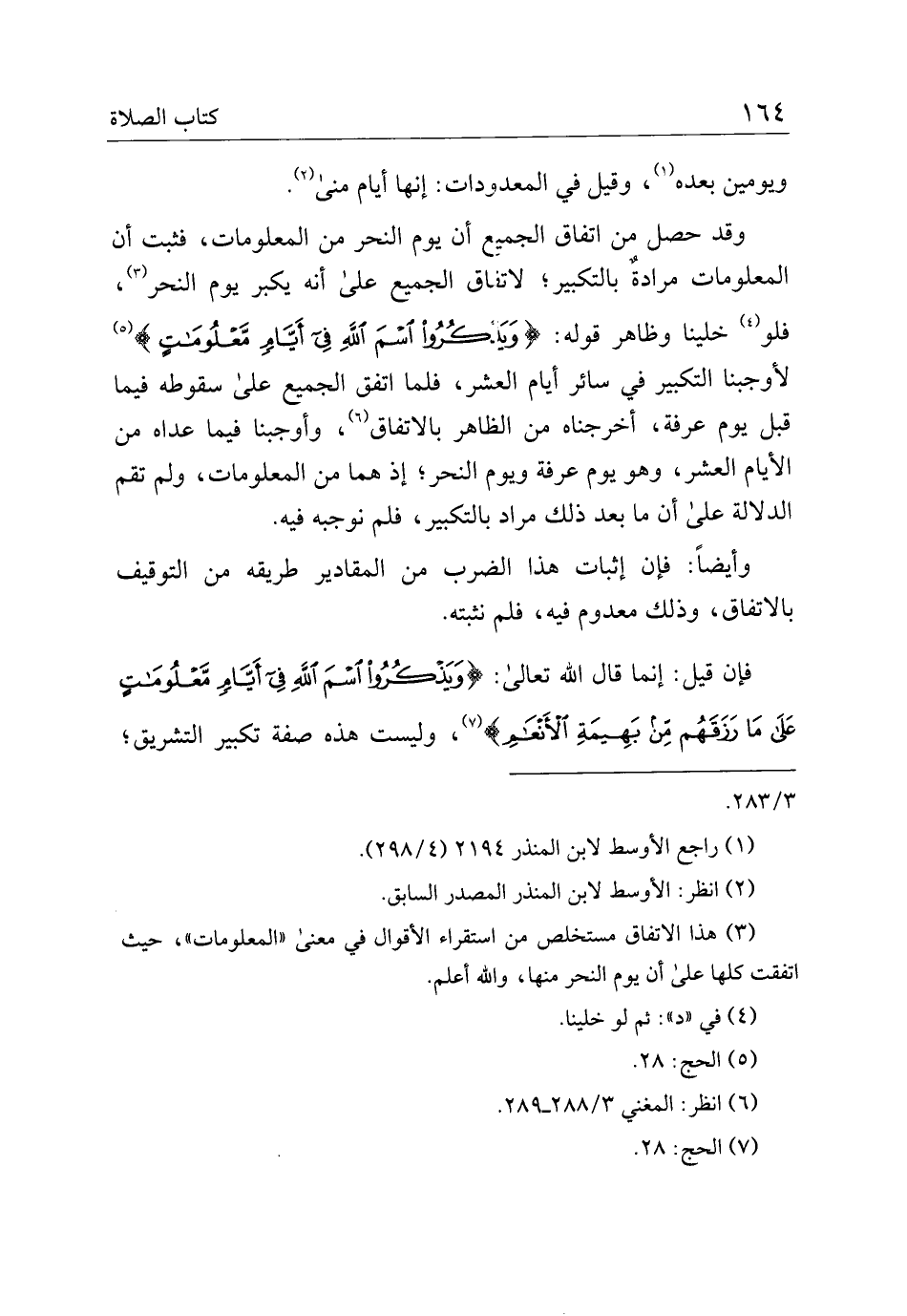 وقد حصل من اتفاق الجميع ان يوم النحر من المعلومات، فثبت أن المعلومات مرادة بالتكبير؛ لاتفاق الجميع على أنه يكبر يوم النحر، فلو خلينا وظاهر قوله: {ويذكروا اسم الله في أيام معلومات} لأوجبنا التبكير في سائر أيام العشر، فلما اتفق الجميع على سقوطه فيما قبل يوم عرفة، أخرجناه من الظاهر بالاتفاق، وأوجبنا فيما عداه من الأيام العشر، وهو يوم عرفة ويوم النحر، إذ هما من المعلومات، ولم تقم الدلالة على أن ما بعد ذلك مراد بالتكبير، فلم نوجيه فيه.