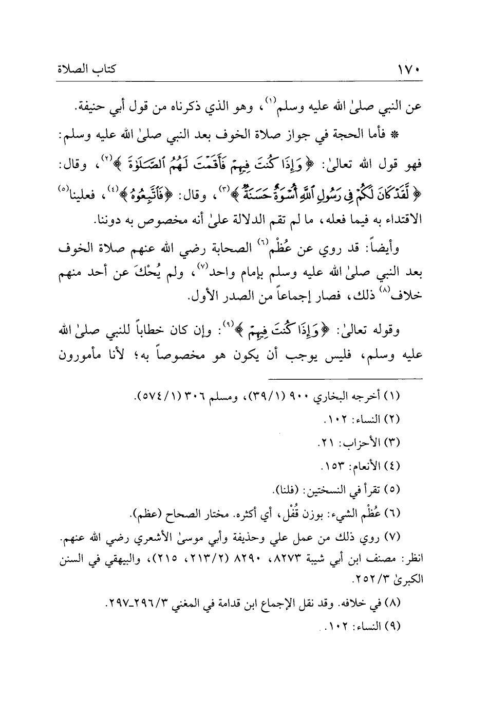* فأما الحجة في جواز صلاة الخوف بعد النبي صلى الله عليه وسلم: فهو قول الله تعالى: {وإذا كنت فيهم فأقمت لهم الصلاة}، وقال {لقد كان لكم في رسول الله أسوة حسنة}، وقال: {فاتبعوه}، فعلينا الاقتداء به فيما فعله، ما لم تقم الدلالة على أنه مخصوص به دوننا.
