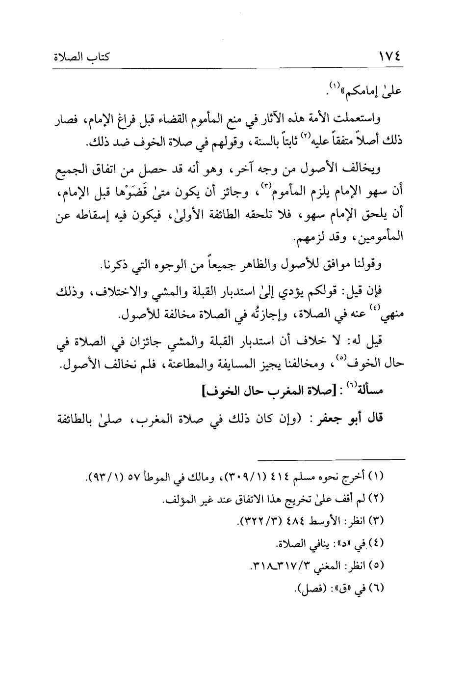 قال أبو جعفر: (وإن كان ذلك في صلاة المغرب، صلى بالطائفة