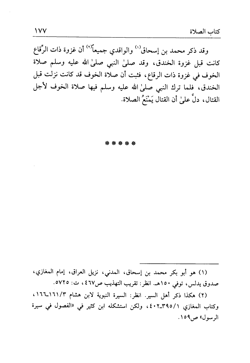 وقد ذكر محمد بن إسحاق والواقدي جميعًا أن غزوة ذات الرقاع كانت قبل غزوة الخندق، وقد صلى النبي صلى الله عليه وسلم صلاة الخوف في غزوة ذات الرقاع، فثبت أن صلاة الخوف قد كانت نزلت قبل الخندق، فلما ترك النبي صلى الله عليه وسلم فيها صلاة الخوف لأجل القتال، دل على أن القتال يمنع الصلاة.