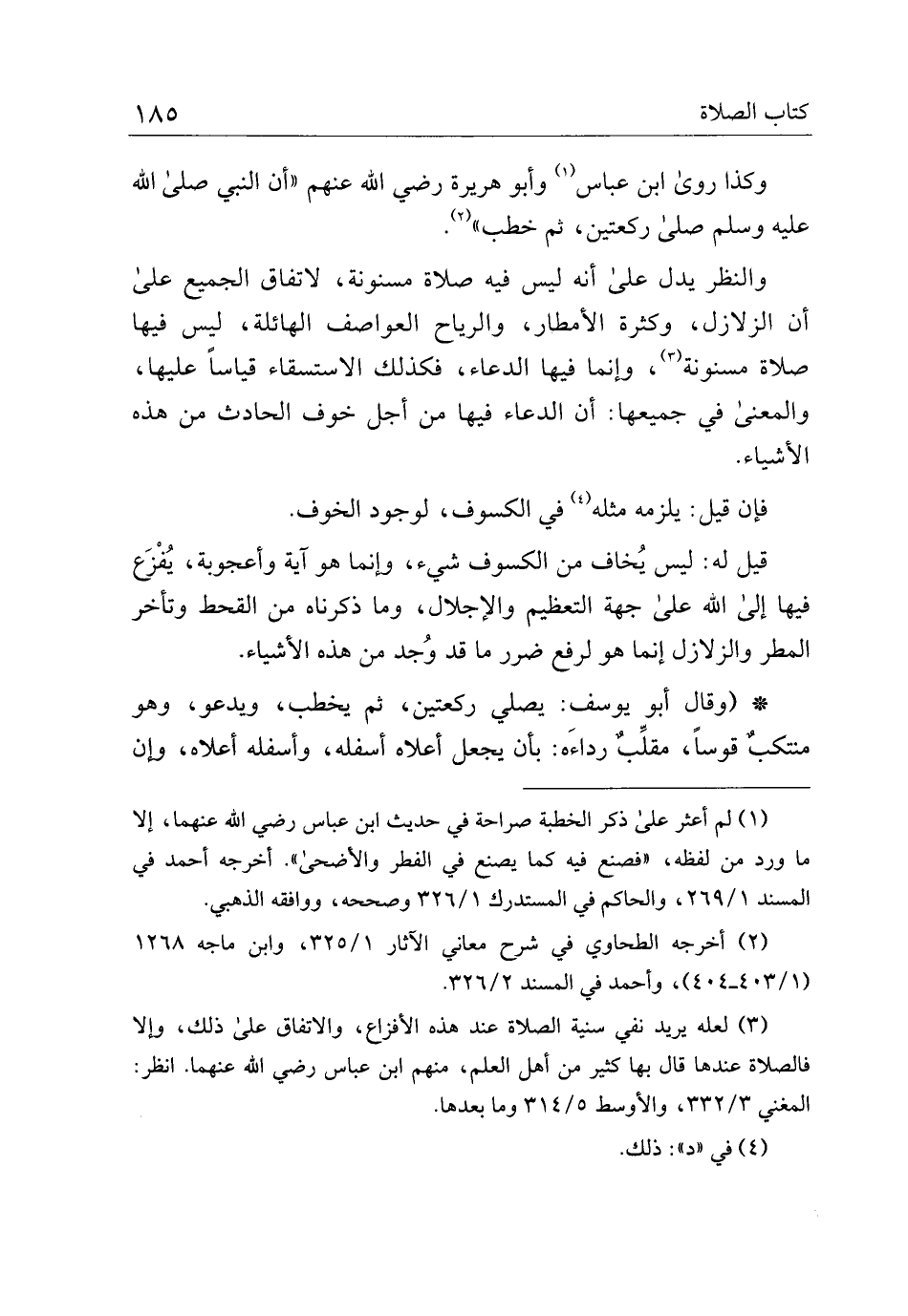 والنظر يدل على أنه ليس فيه صلاة مسنونة، لاتفاق الجميع على ان الزلازل، وكثرة الأمطار، والرياح العواصف الهائلة، لي فيها صلاة مسنونة، وإنما فيها الدعاء، فكذلك الاستقساء قياسًا عليها، والمعنى في جميعها: أن الدعاء فيها من أجل خوف الحادث من هذه الأشياء.