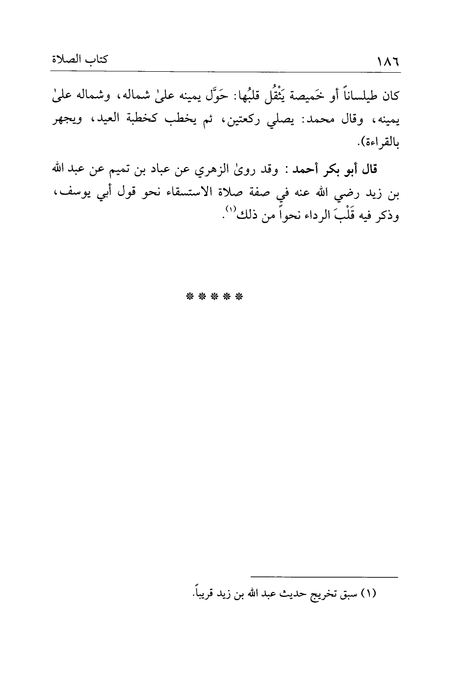 قال أبو بكر أحمد: وقد روى الزهري عن عباد بن تميم عن عبد الله بن زيد رضي الله عنه في صفة صلاة الاستقساء نحو قول أبي يوسف، وذكر فيه قلب الرداء نحوًا من ذلك.