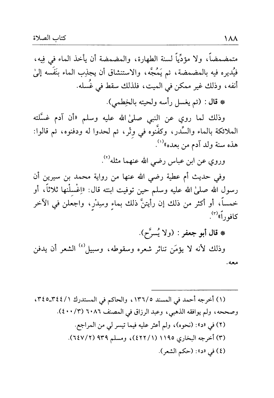 وفي حديث أم عطية رضي الله عنها من رواية محمد بن سيرين ان رسول الله ص حين توفيت ابنته قال: "اغسلنها ثلاثًا، أو خمسًا، أو أكثر من ذلك إن رأيتن ذلك بماء وسدر، واجعلن في الآخر كافورًا".