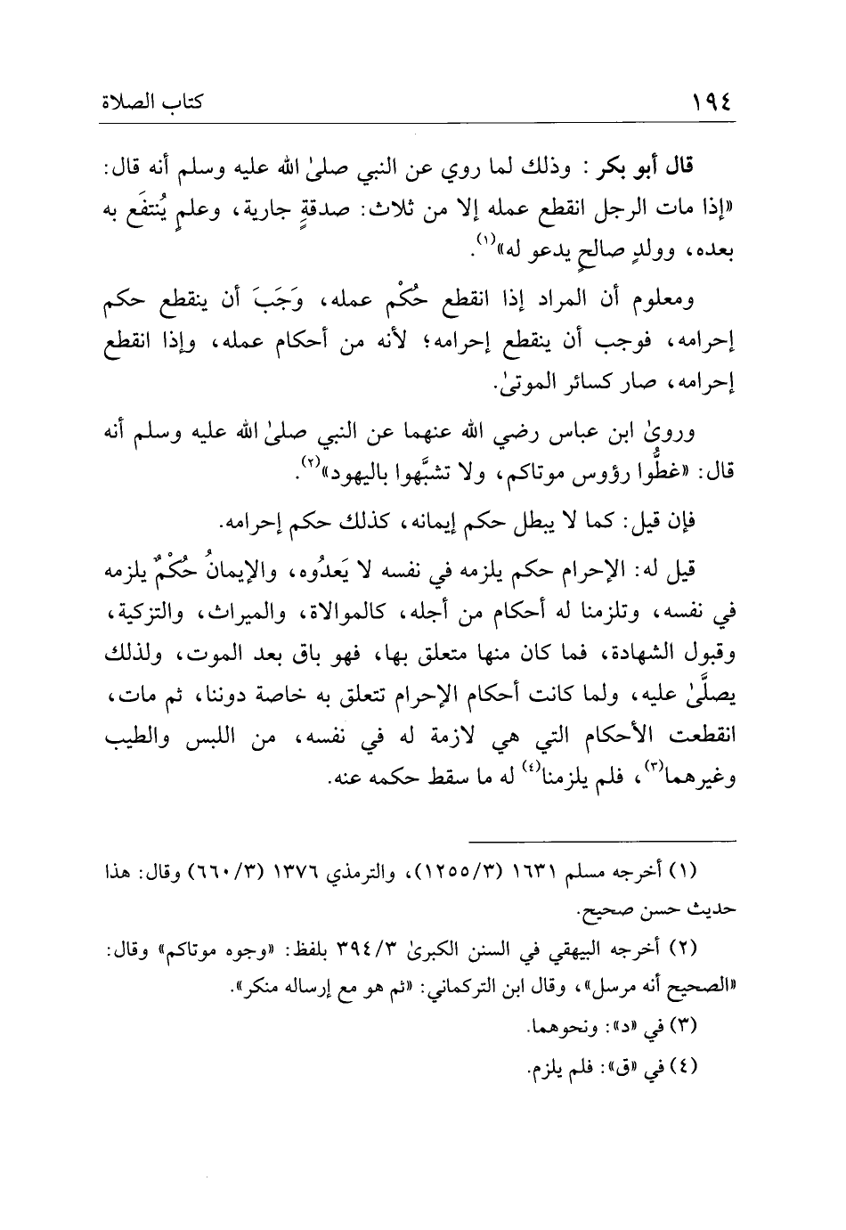 قيل له: الإحرام حكم يلزمه في نفسه لا يعدوه، والإيمان حكم يلزمه في نفسه، وتلزمنا له أحكام من أجله، كالموالاة، والميراث، والتزكية، وقبول الشهادة، فما كان منها متعلق بها، فهو باق بعد الموت، ولذلك يصلى عليه، ولما كانت أحكام الإحرام تتعلق به خاصة دوننا، ثم مات، انقطعت الأحكام التي هي لازمة له في نفسه، من اللبس والطيب وغيرهما، فلم يلزمنا له ما سقط حكمه عنه.