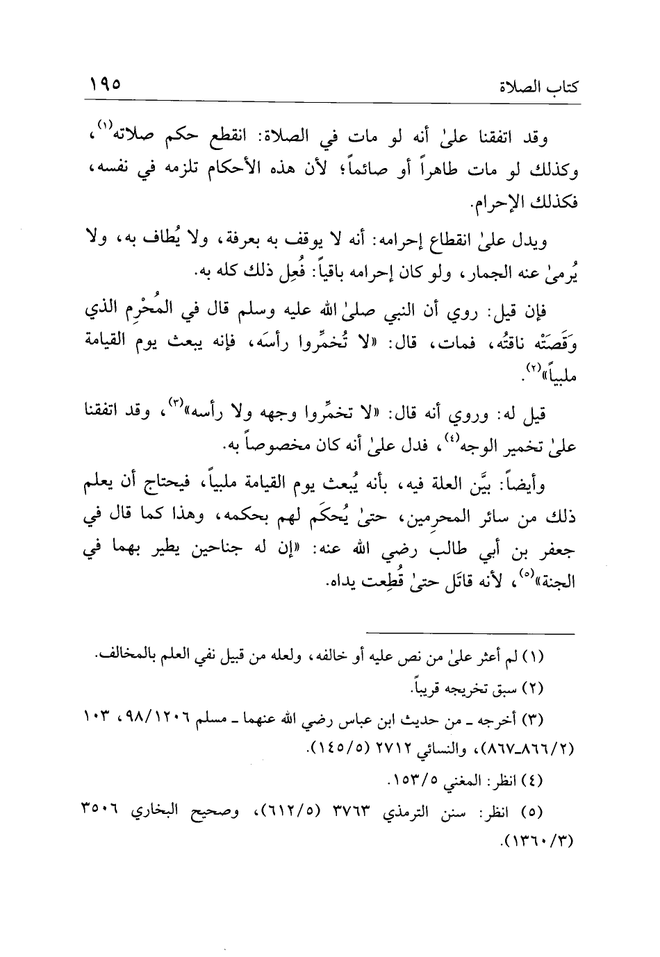 وقد اتفقنا على "أنه لو مات في الصلاة: انقطع حكم صلاته، وكذلك لو مات طاهرًا أو صائمًا؛ لأن هذه الأحكام تلزمه في نفسه، فكذلك الإحرام.