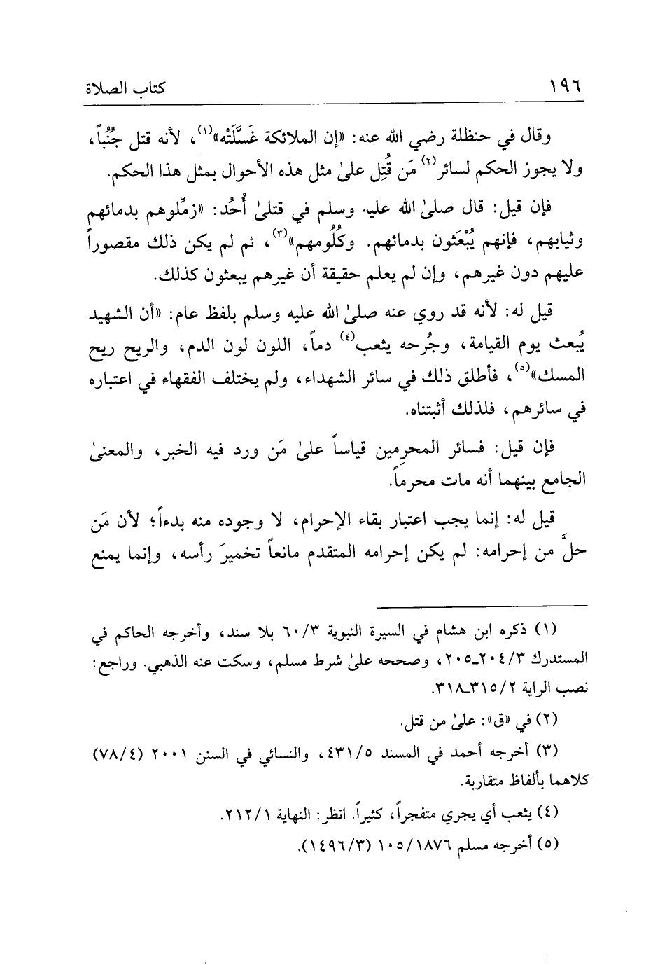 وقال في حنظلة رضي الله عنه: "إن الملائكة غسلته"، لأنه قتل جنبًا، ولا يجوز الحكم لسائر من قتل على مثل هذه الأحوال بمثل هذا الحكم.