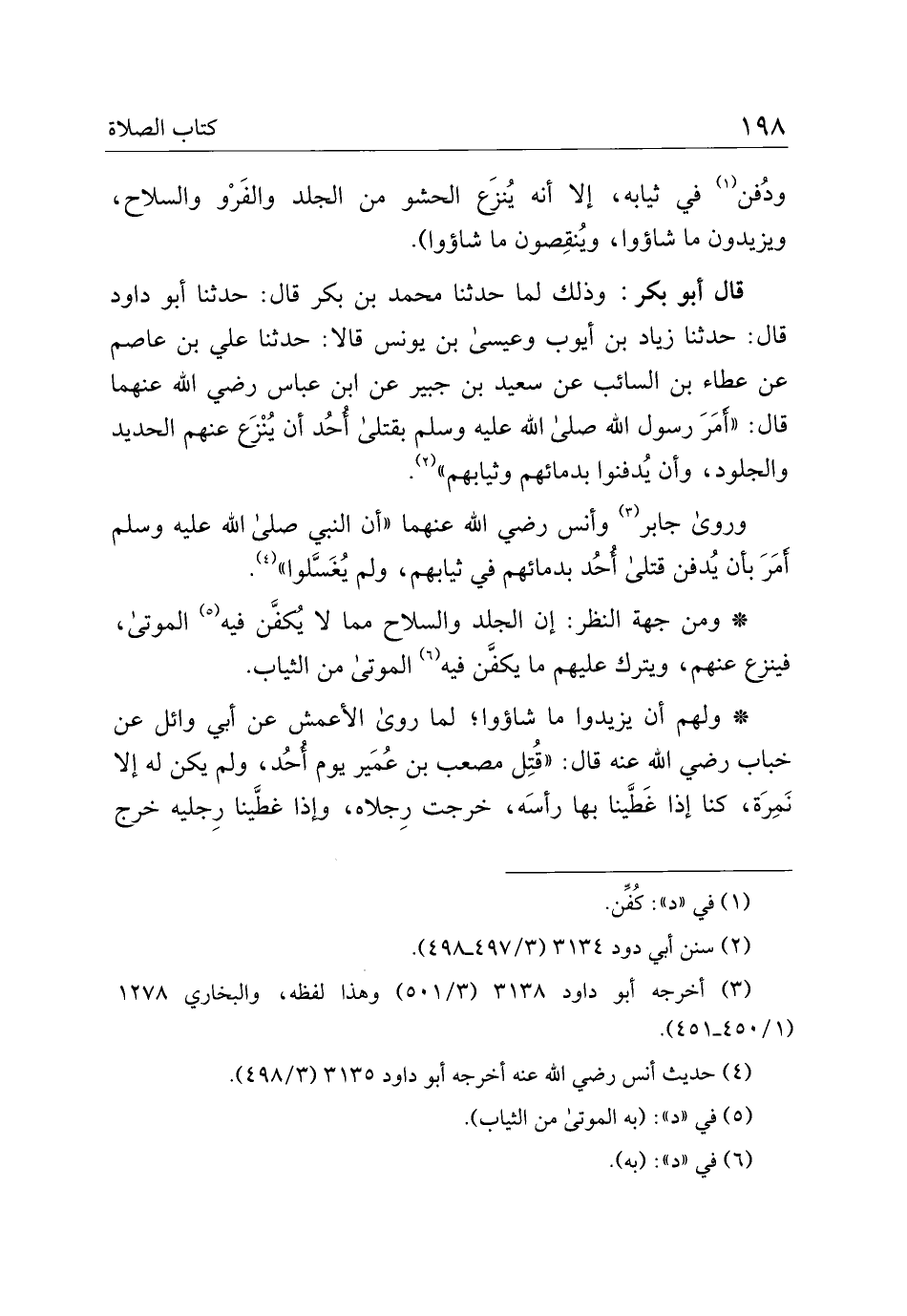 قال أبو بكر: وذلك لما حدثنا محمد بن بكر قال: حدثنا أبو داود قال: حدثنا زياد بن أيوب وعيسى بن يونس قالاً: حدثنا علي بن عاصم عن عطاء بن السائب عن سعيد بن جبير عن ابن عباس رضي الله عنهما قال: "أمر رسول الله صلى الله عليه وسلم بقتلى أحد أن ينزع عنهم الحديد الجلود، وأن يدفنوا بدمائهم وثيابهم".
