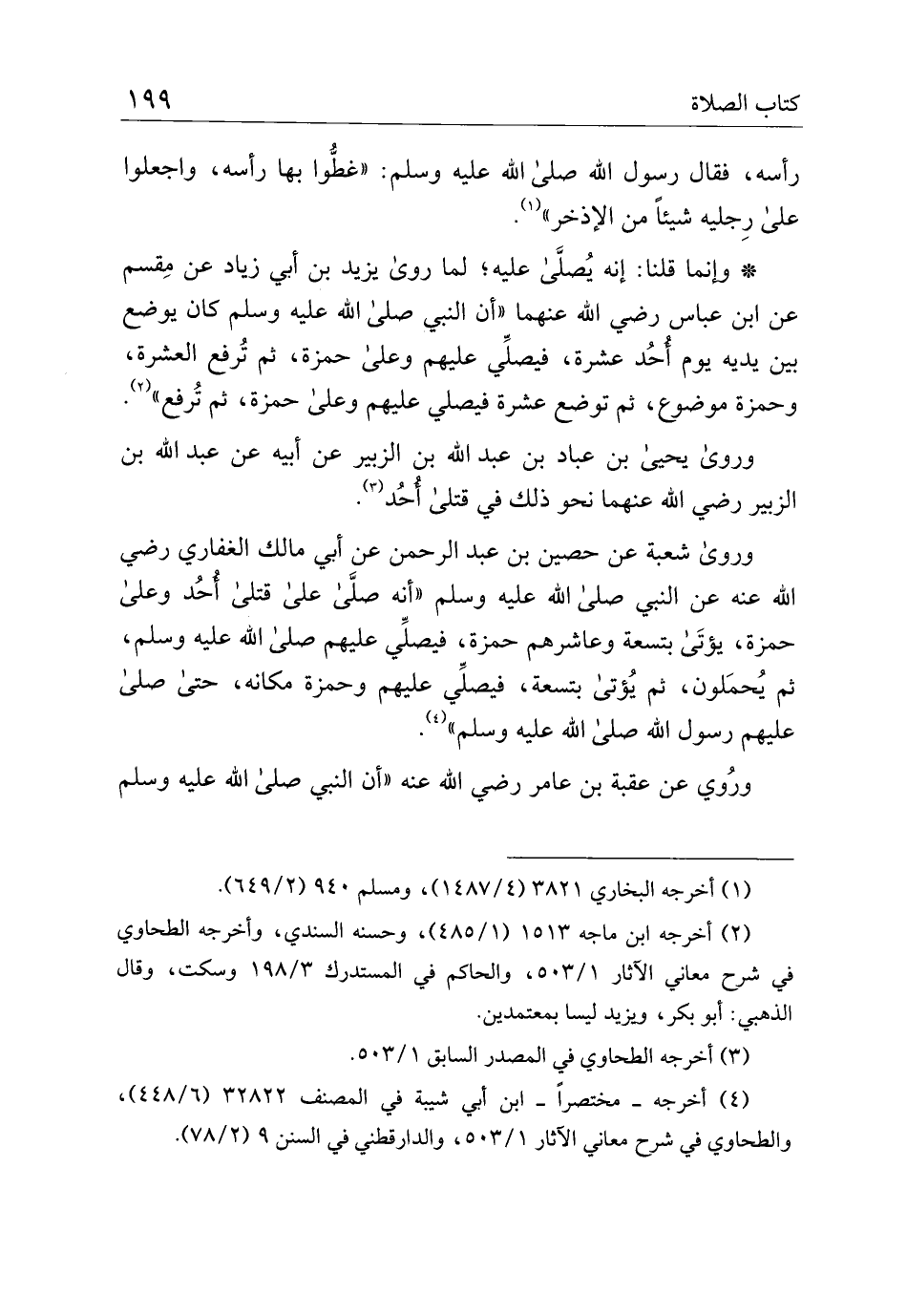 وروى يحيي بن عباد بن عبد الله بن الزبير عن أبيه عن عبد الله بن الزبير رضي الله عنهما نحو ذلك في قتلى أحد.