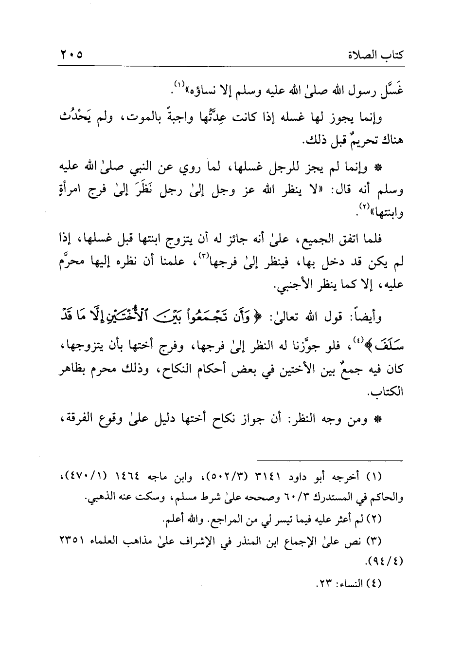 فلما اتفق الجميع، على أنه جائز له أن يتزوج ابنتها قبل غسلها، إذا لم يكن قد دخل بها، فينظر إلى فرجها، علمنا أنظره إليها محرم عليه، إلا كما ينظر الأجنبي.